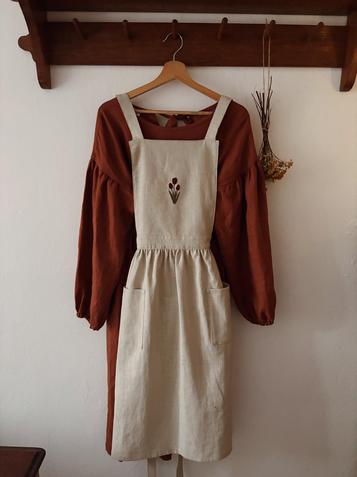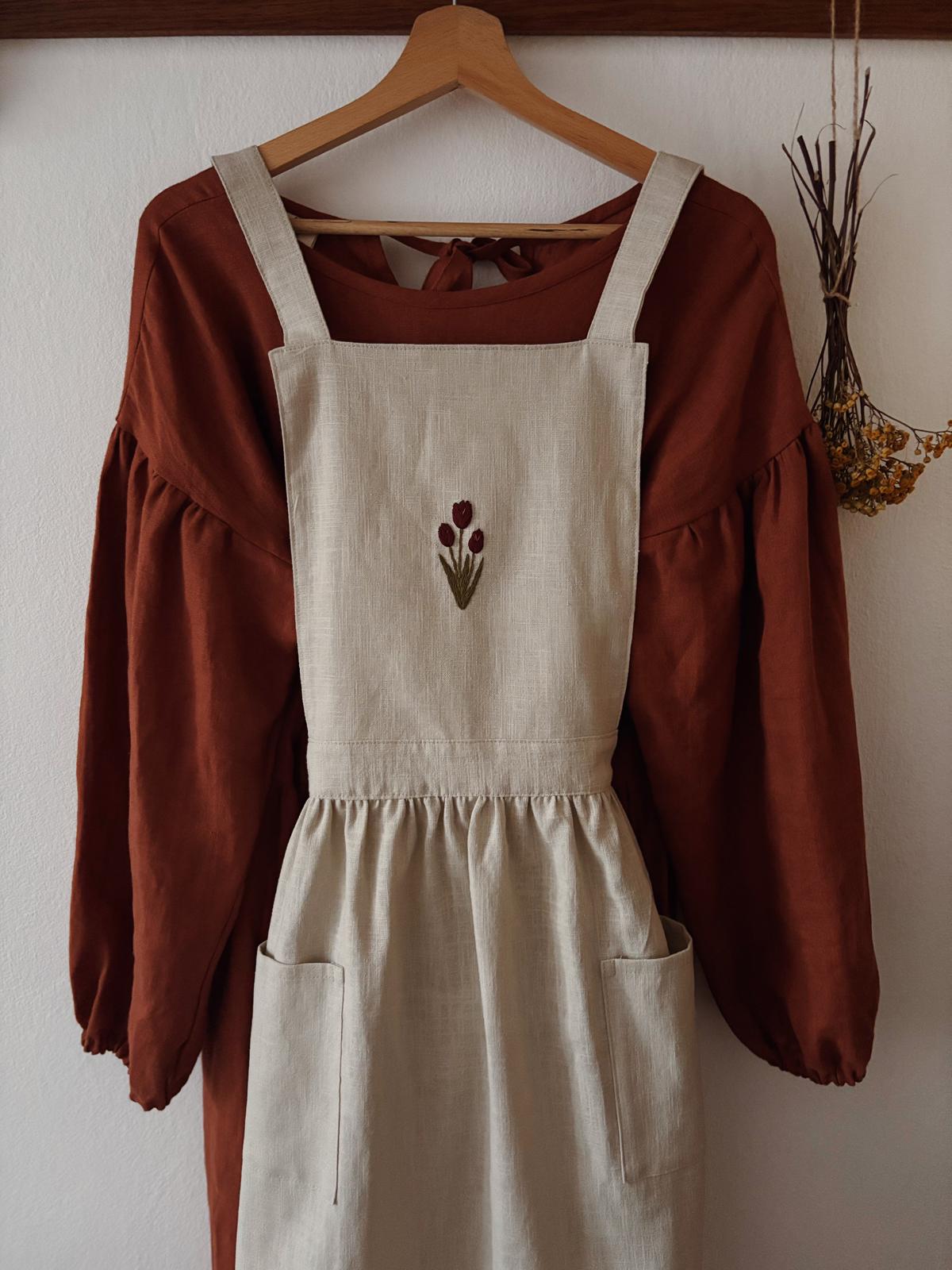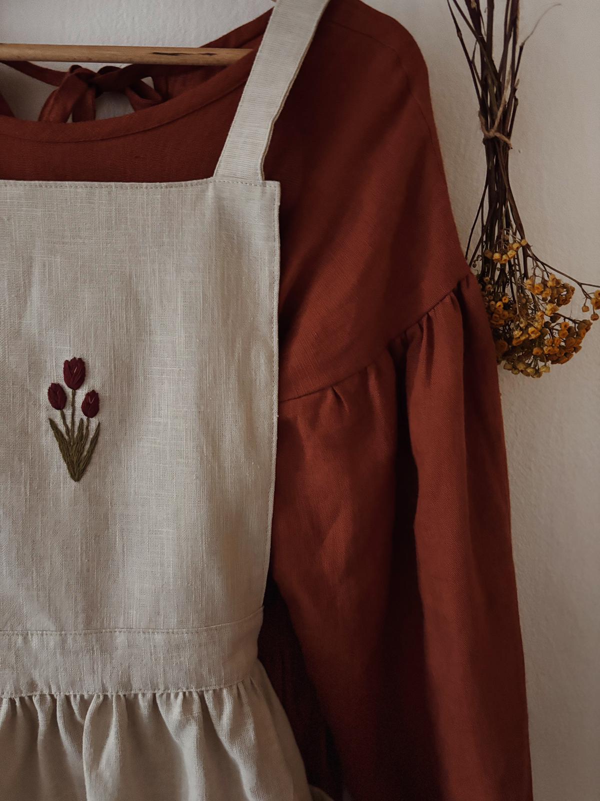 Ručně vyšívaná lněná venkovská zástěra pro milovnice cottagecore stylu, rustikální kuchyně, venkovského života a kvalitní ruční práce. Perfektní jako dárek pro milovníky pečení, vaření nebo zahradničení.
