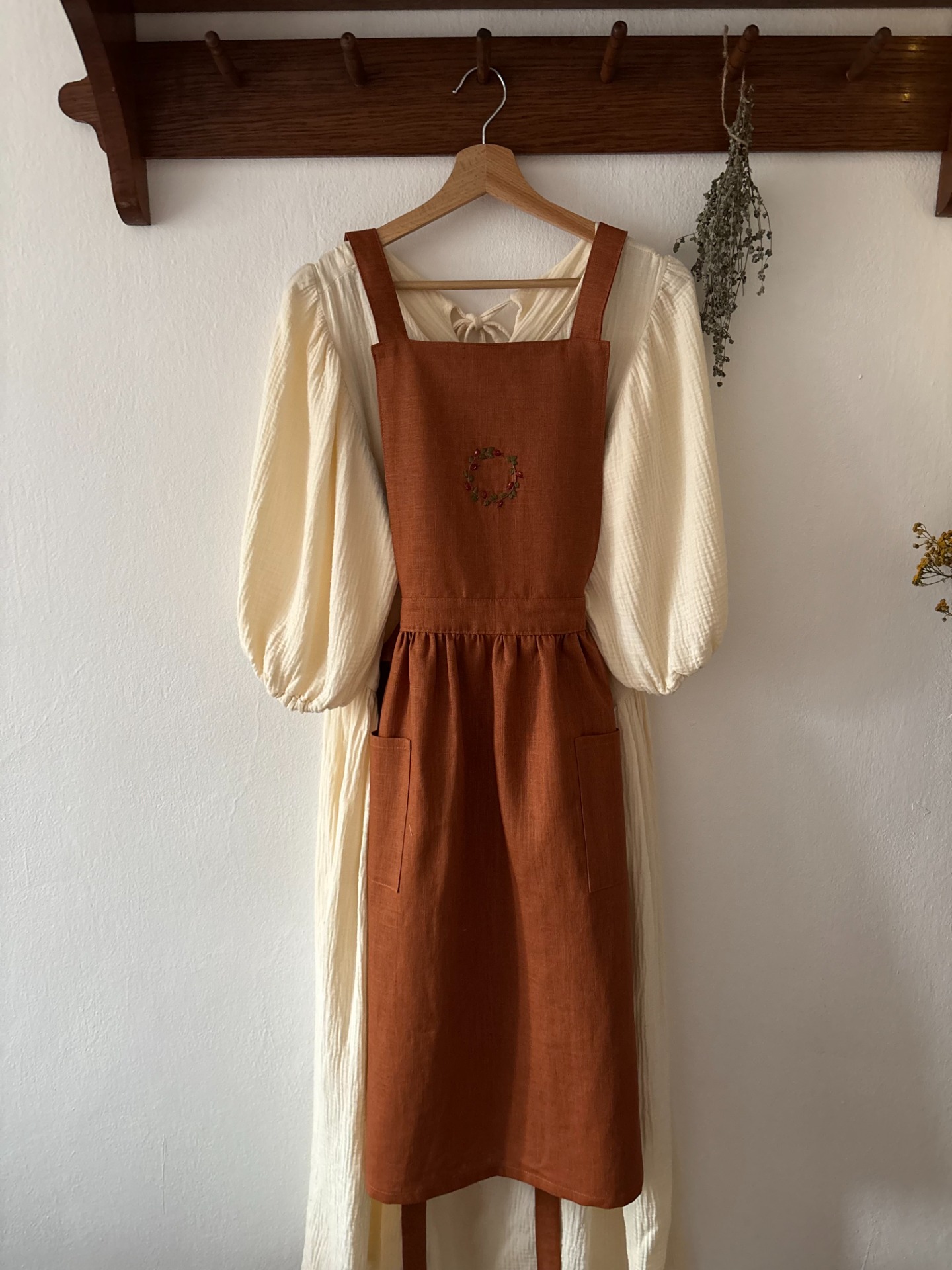 Ručně vyšívaná lněná venkovská zástěra pro milovnice cottagecore stylu, rustikální kuchyně, venkovského života a kvalitní ruční práce. Perfektní jako dárek pro milovníky pečení, vaření nebo zahradničení.