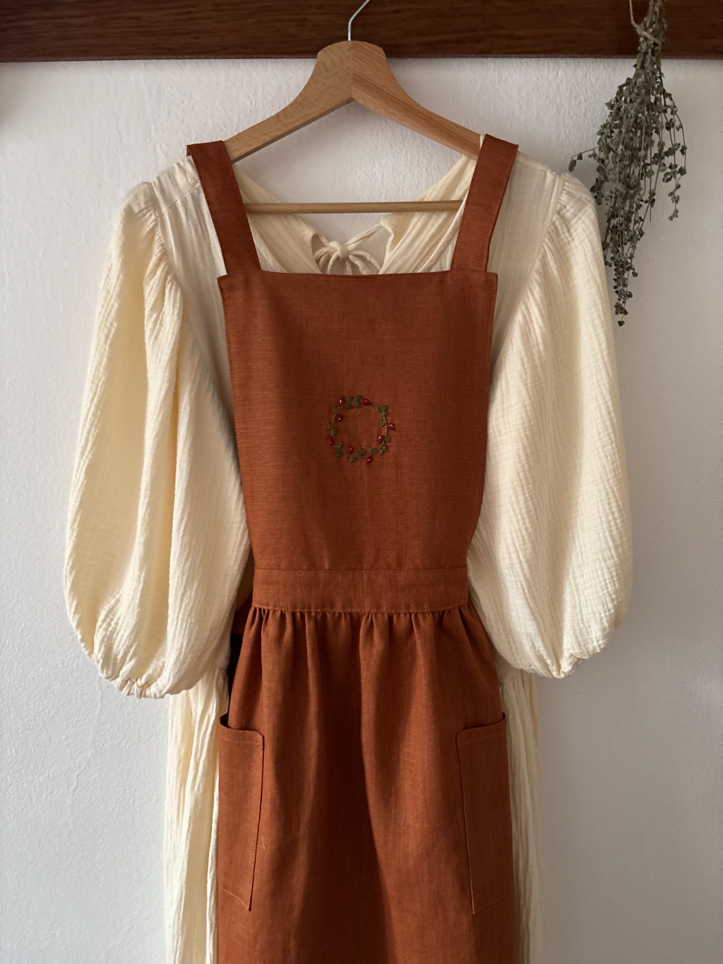 Lněná šatová zástěra - Hnědá/Terakota se šípkovým věncem