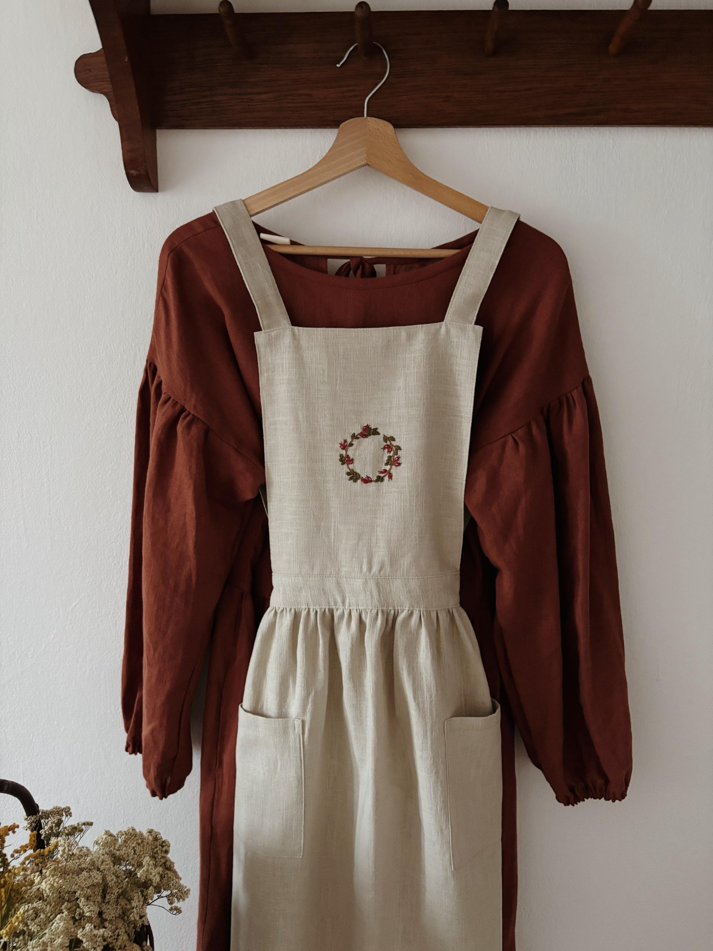 Lněná šatová zástěra - Béžová se šípkovým věncem