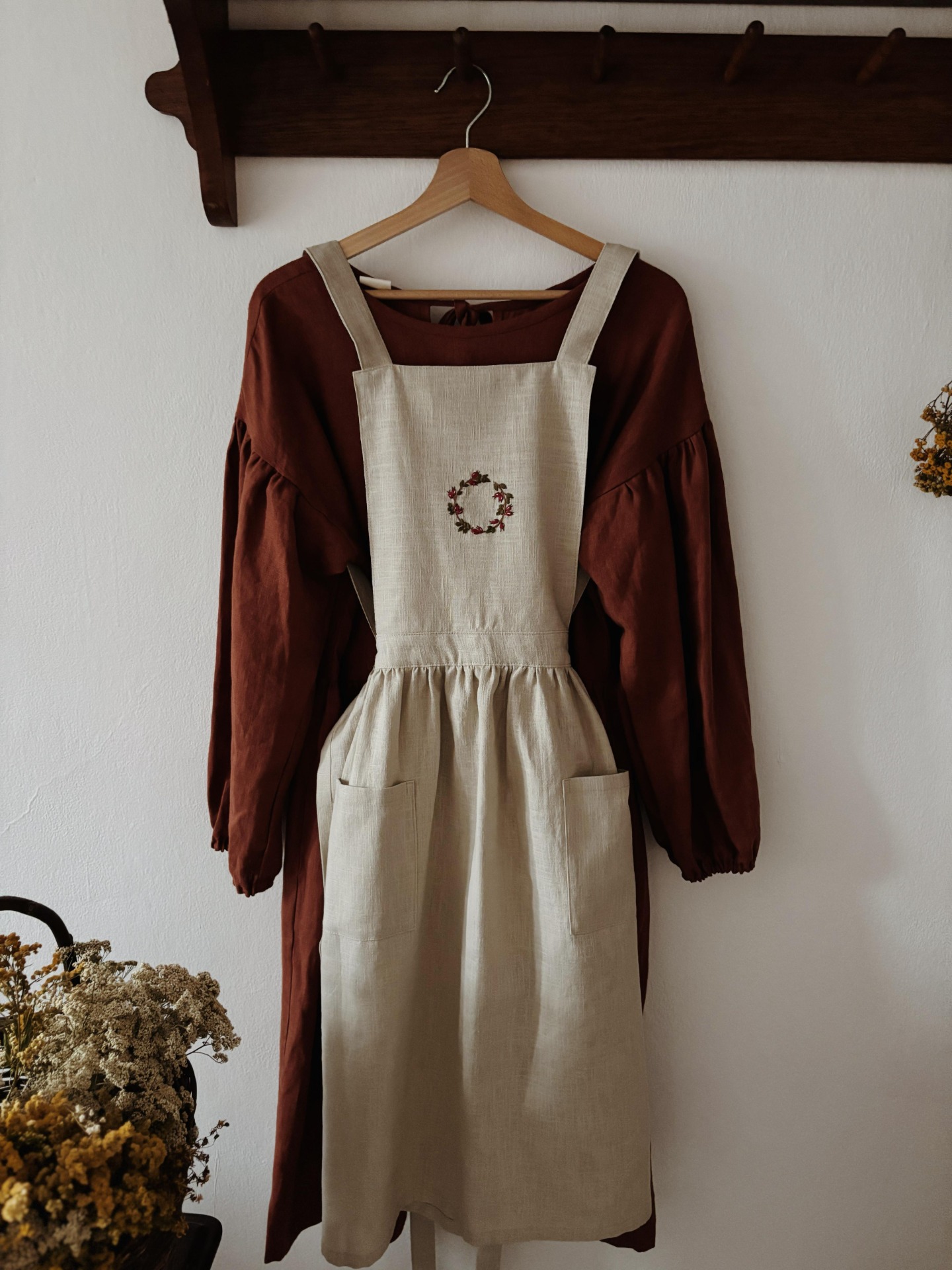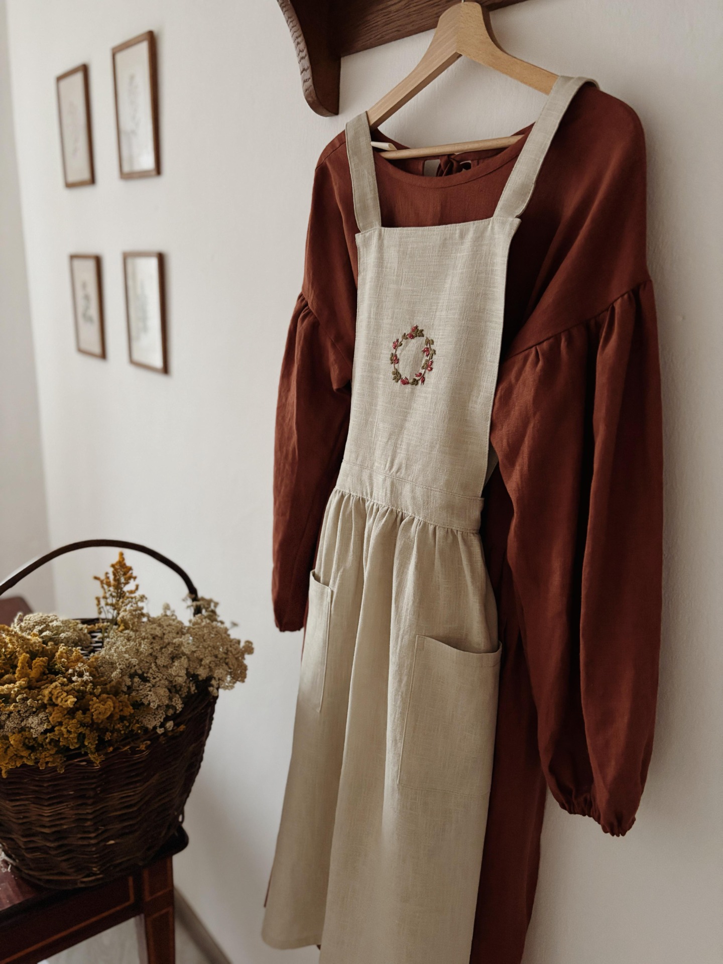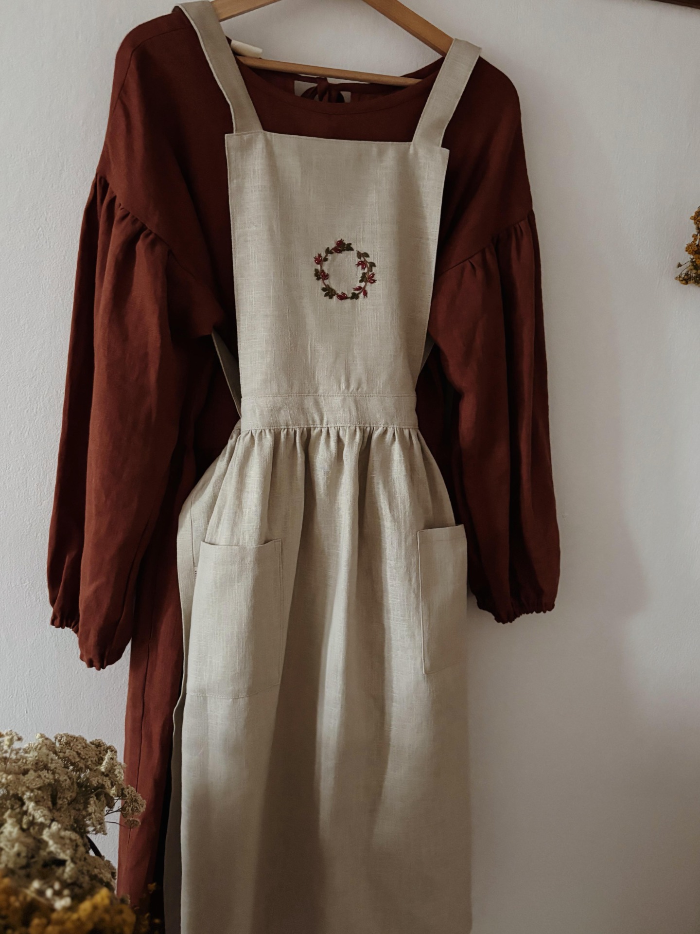 Ručně vyšívaná lněná venkovská zástěra pro milovnice cottagecore stylu, rustikální kuchyně, venkovského života a kvalitní ruční práce. Perfektní jako dárek pro milovníky pečení, vaření nebo zahradničení.