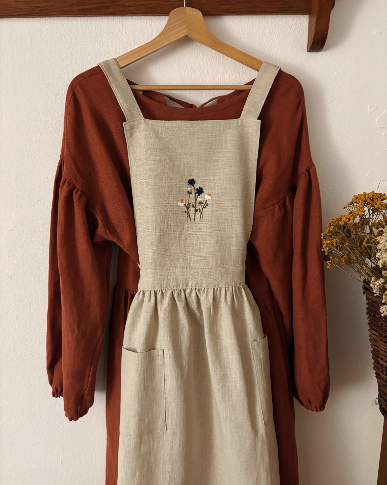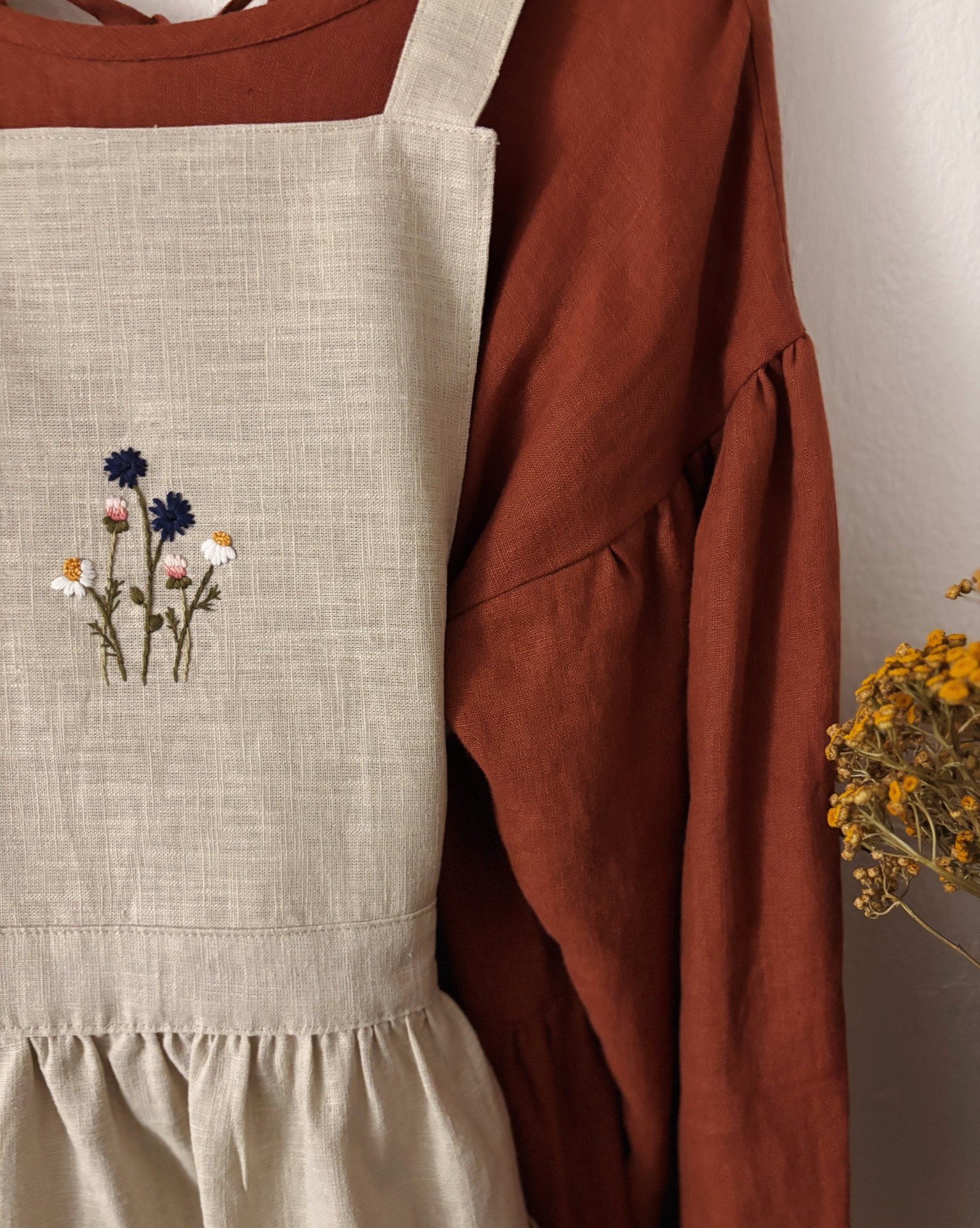 Ručně vyšívaná lněná venkovská zástěra pro milovnice cottagecore stylu, rustikální kuchyně, venkovského života a kvalitní ruční práce. Perfektní jako dárek pro milovníky pečení, vaření nebo zahradničení.