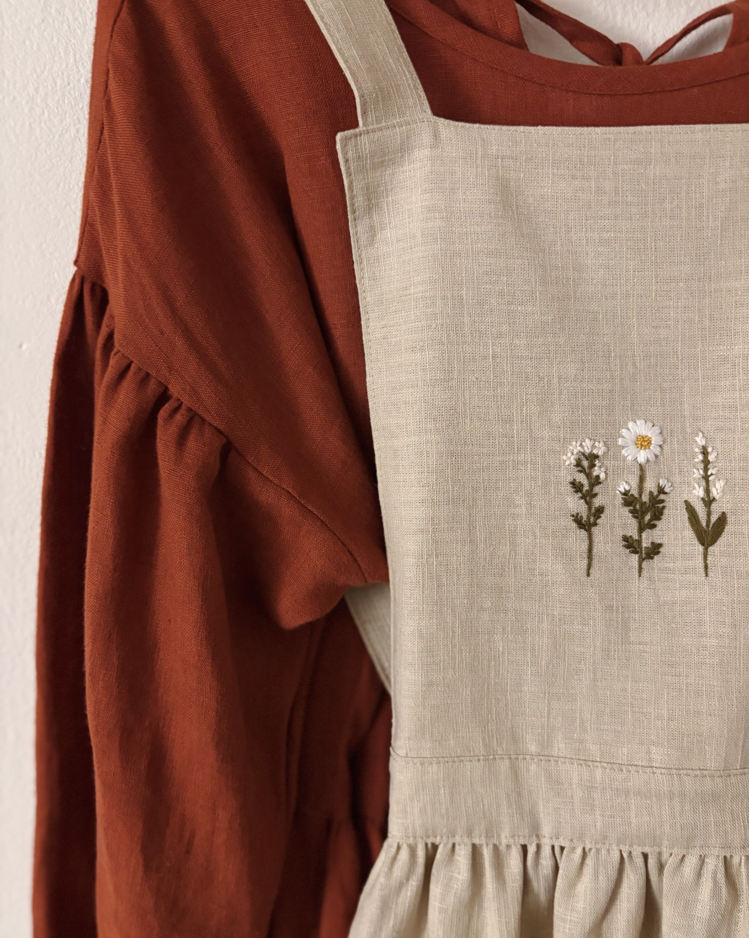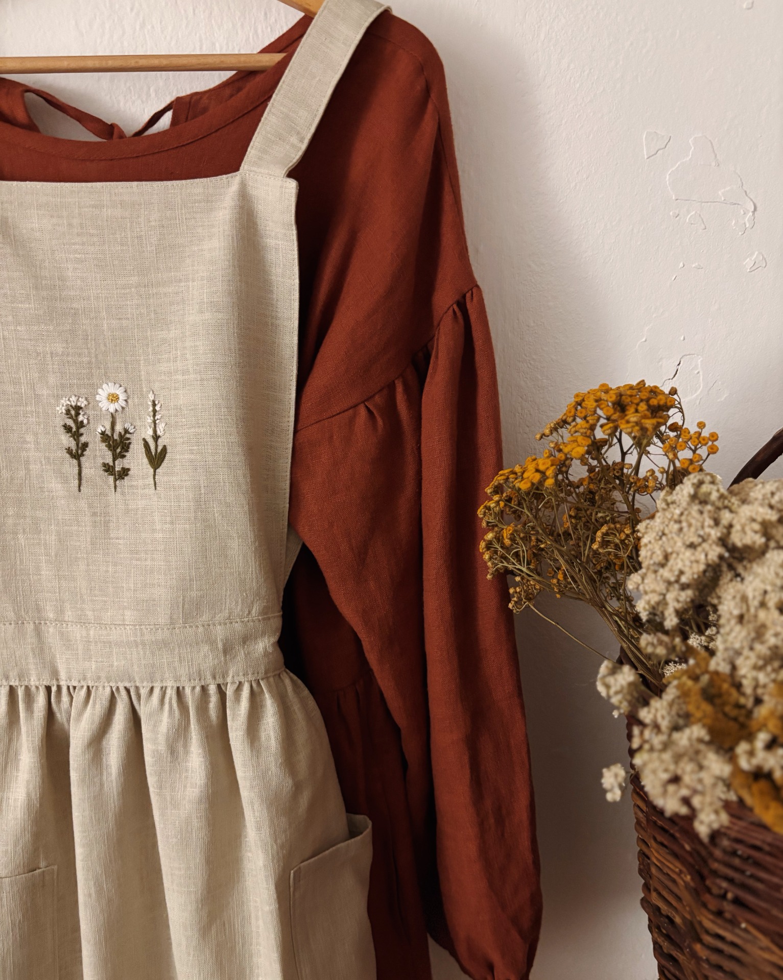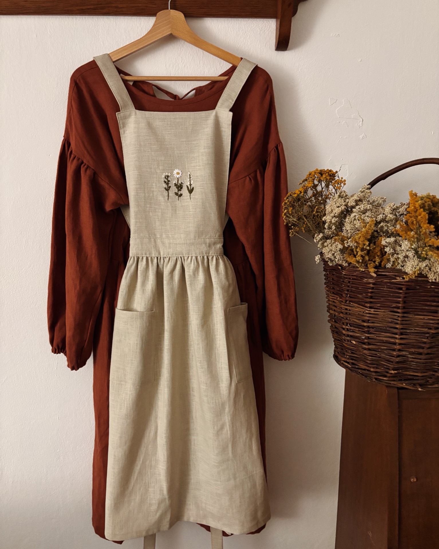 Ručně vyšívaná lněná venkovská zástěra pro milovnice cottagecore stylu, rustikální kuchyně, venkovského života a kvalitní ruční práce. Perfektní jako dárek pro milovníky pečení, vaření nebo zahradničení.