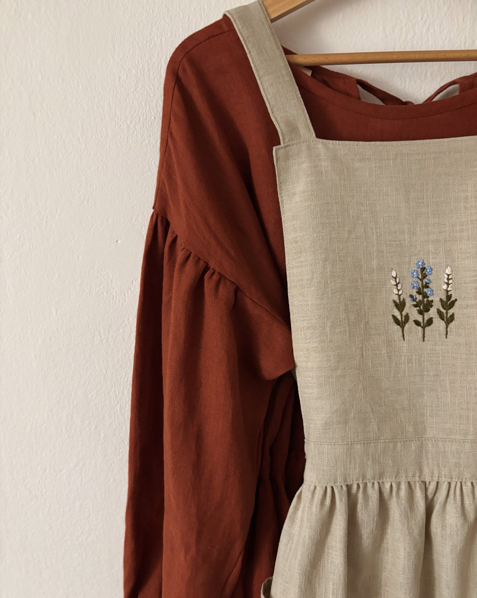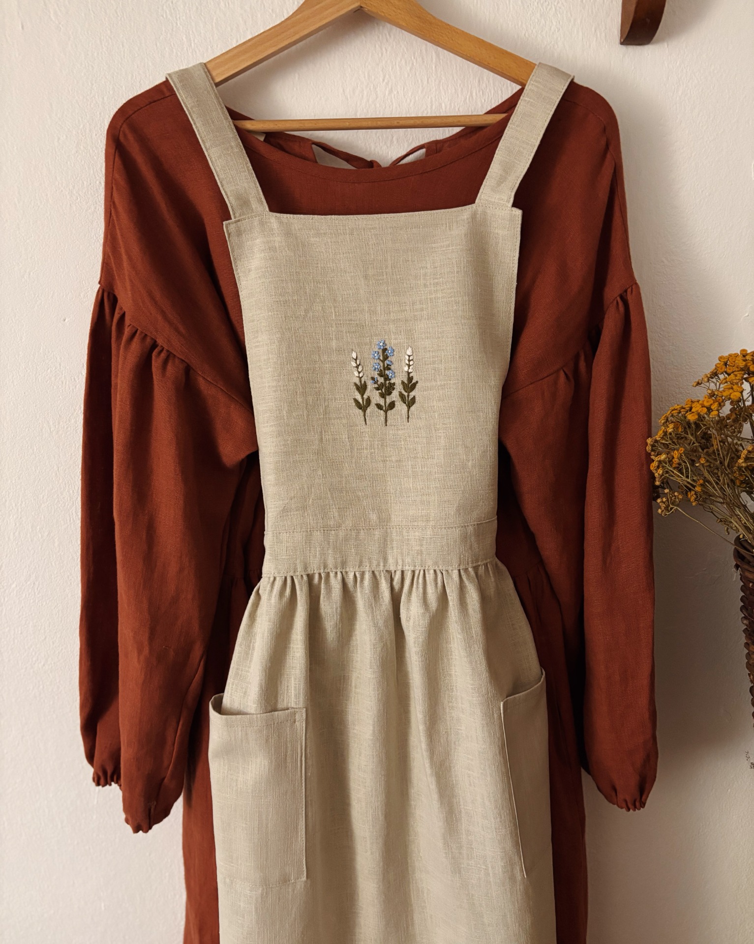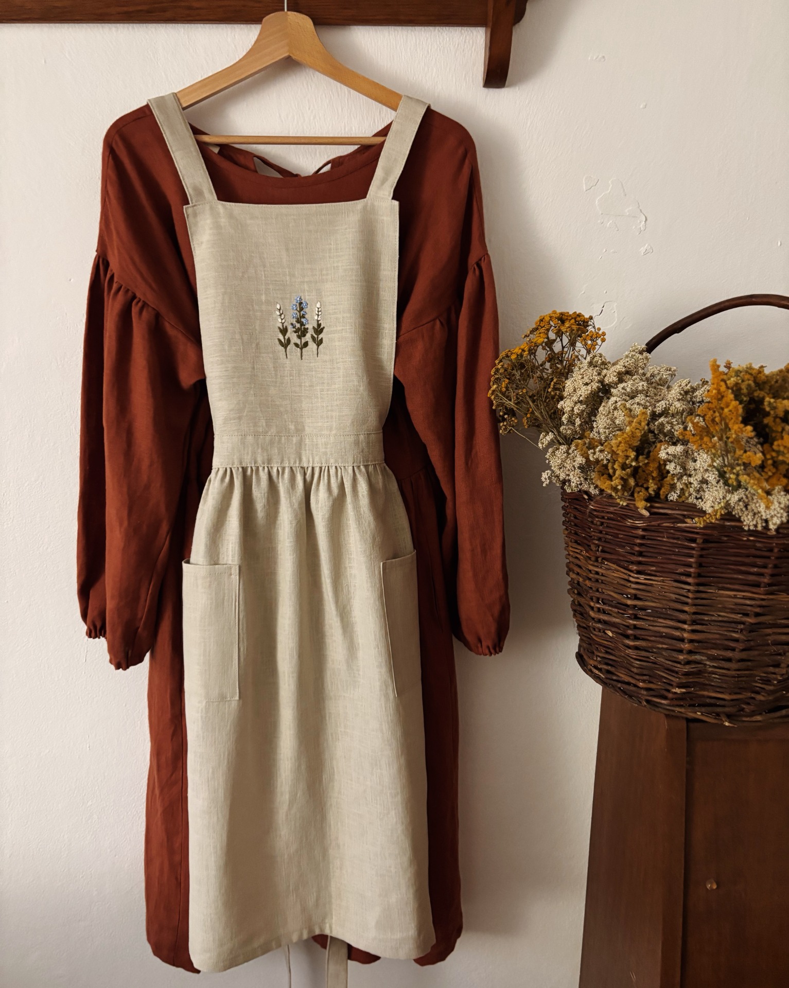 Ručně vyšívaná lněná venkovská zástěra pro milovnice cottagecore stylu, rustikální kuchyně, venkovského života a kvalitní ruční práce. Perfektní jako dárek pro milovníky pečení, vaření nebo zahradničení.