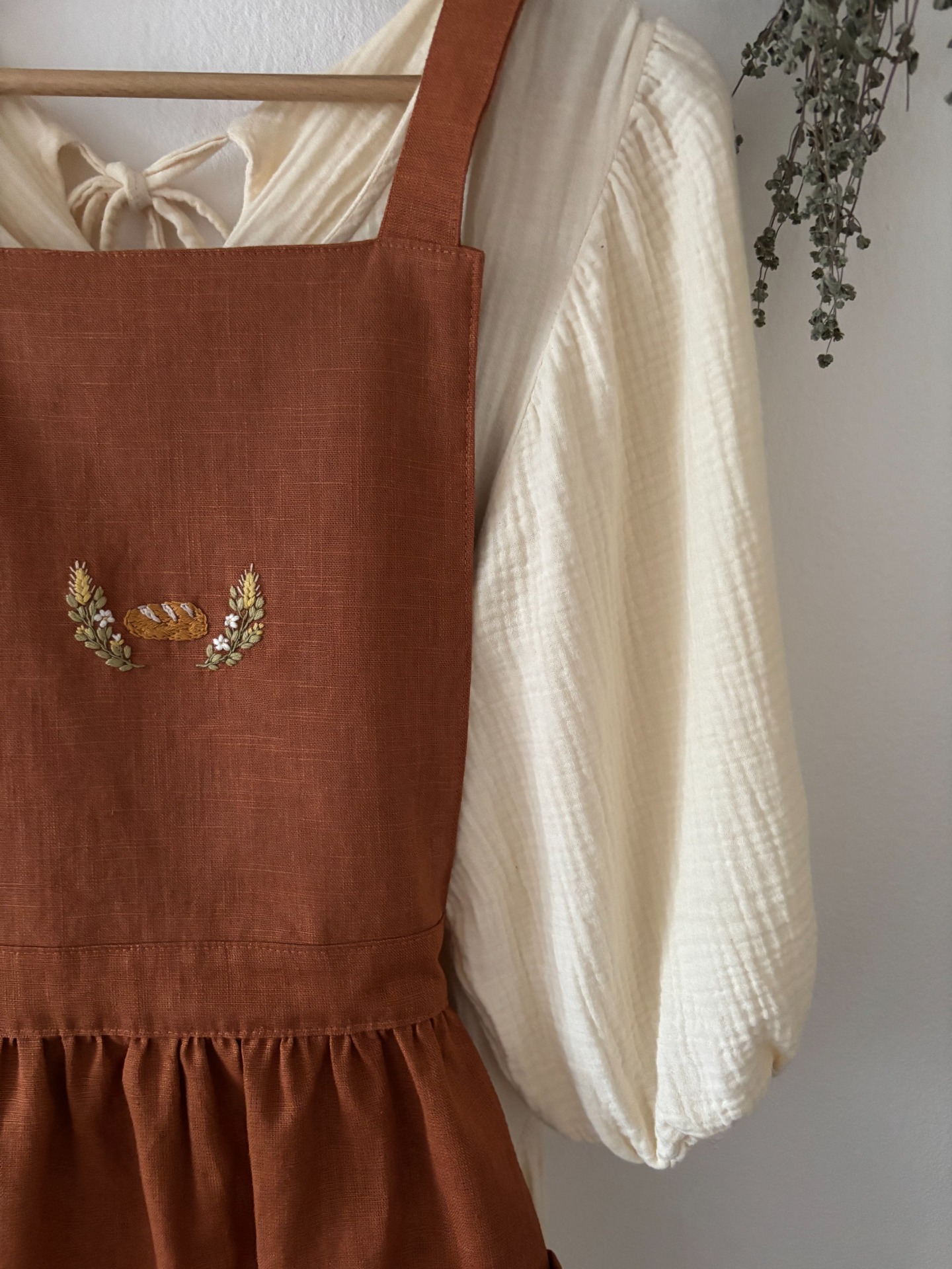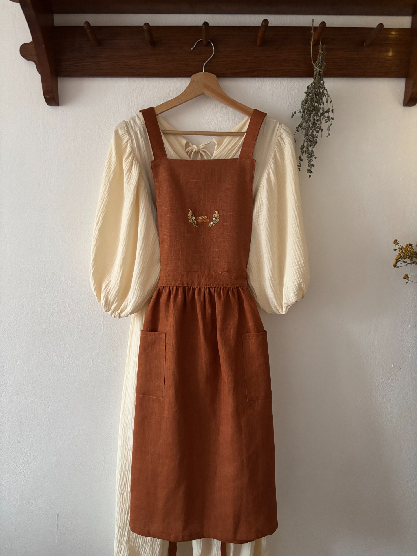 Lněná šatová zástěra - Hnědá/Terakota s bochníkem chleba