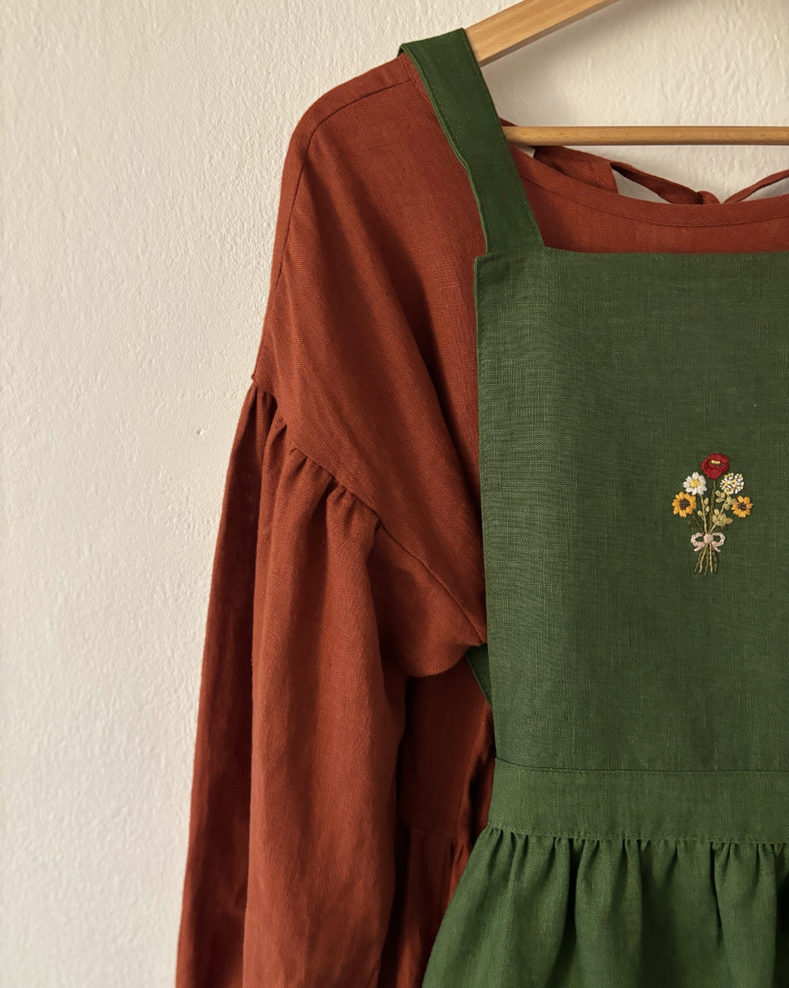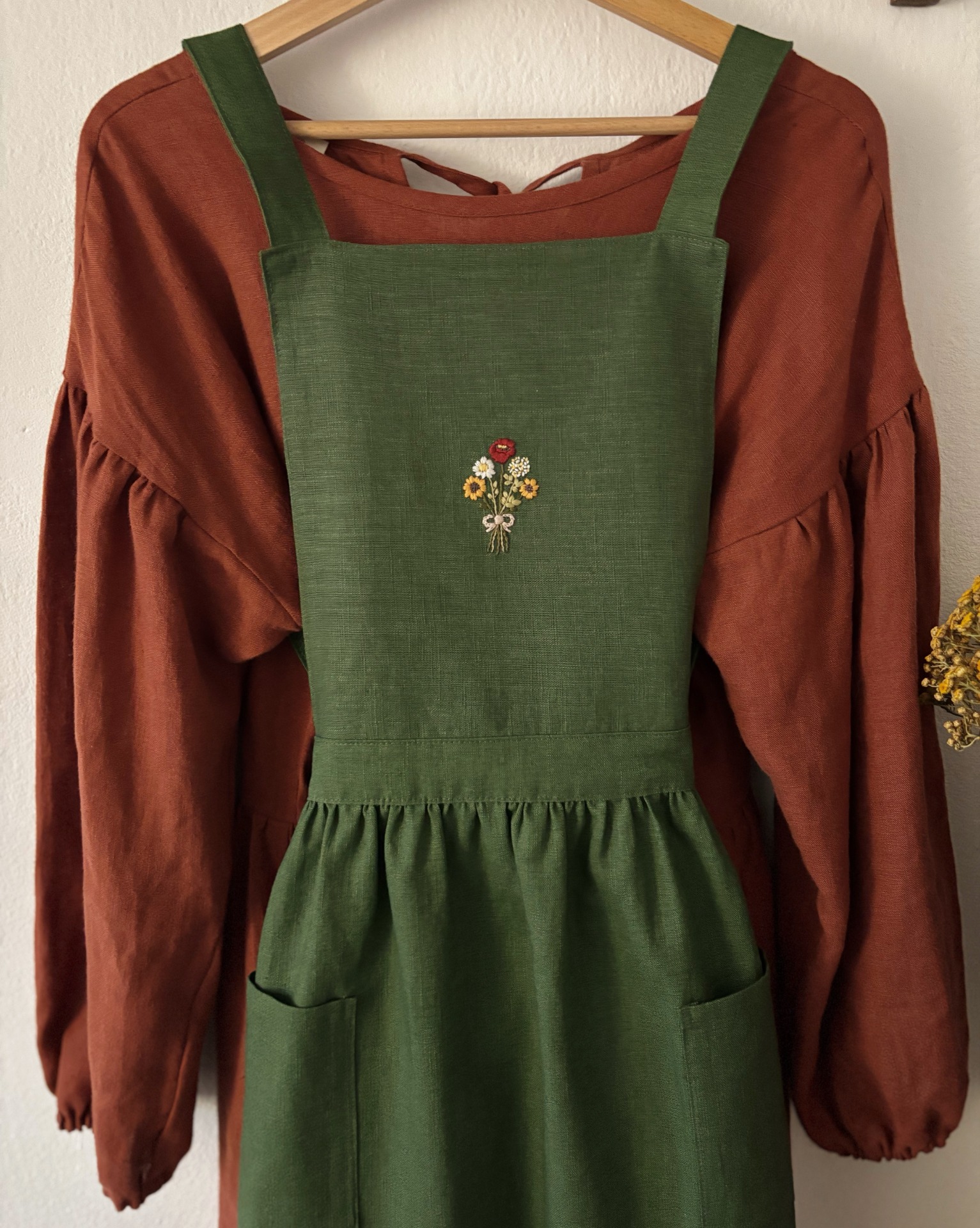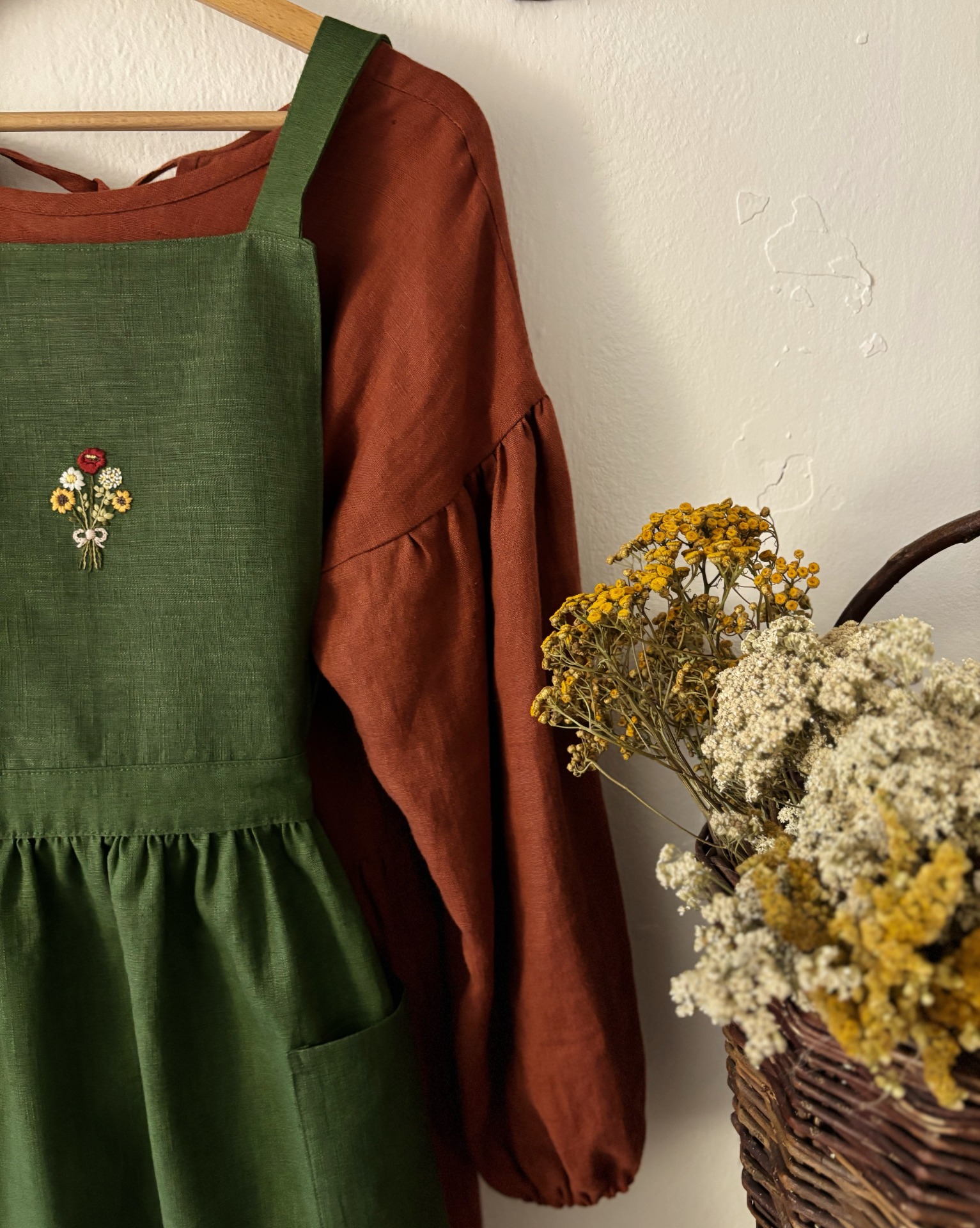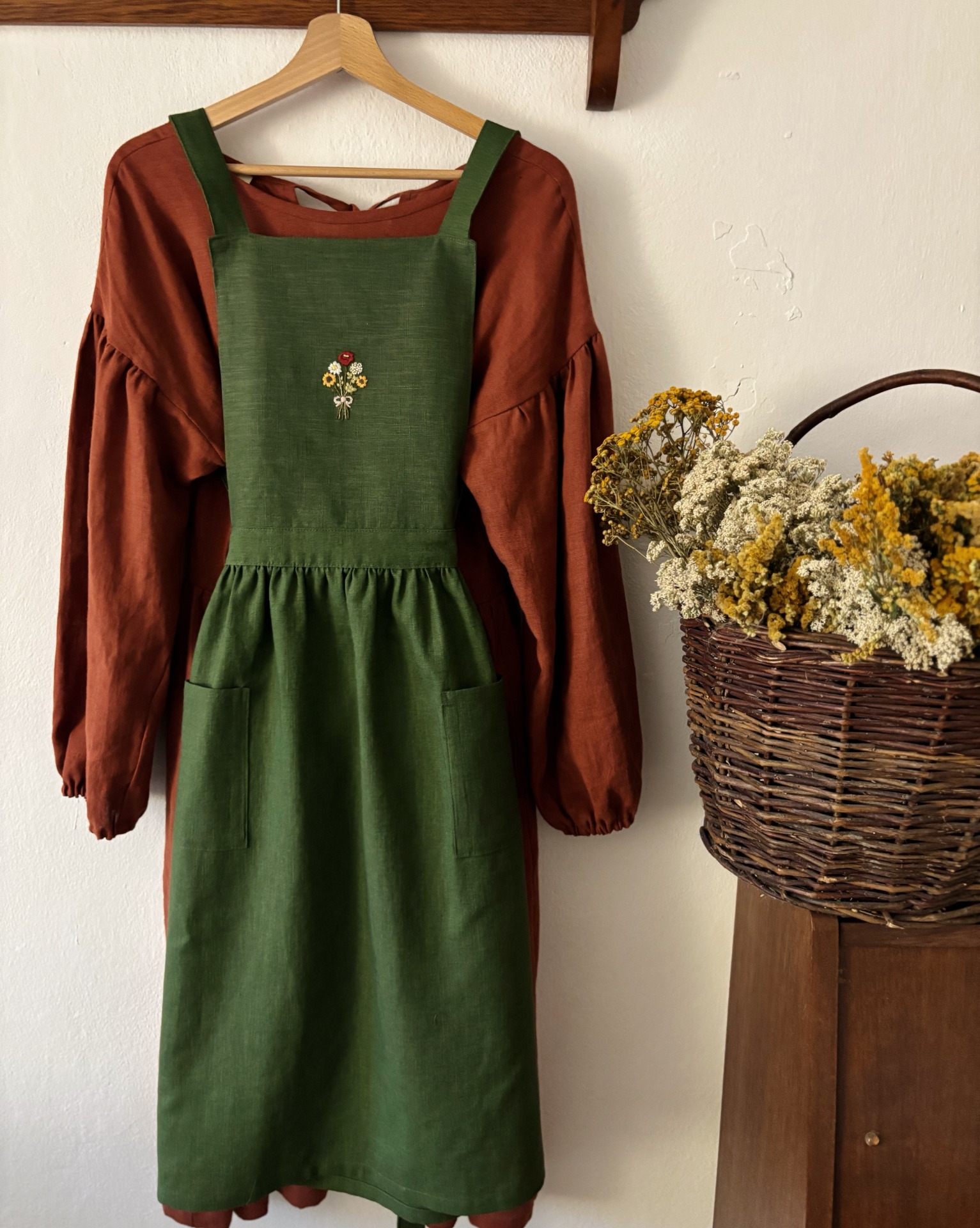 Ručně vyšívaná lněná venkovská zástěra pro milovnice cottagecore stylu, rustikální kuchyně, venkovského života a kvalitní ruční práce. Perfektní jako dárek pro milovníky pečení, vaření nebo zahradničení.