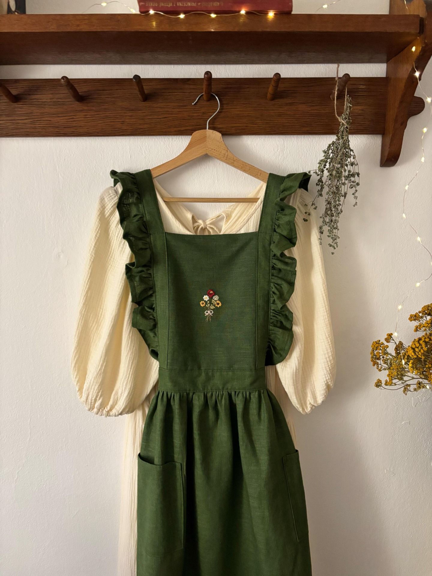 Ručně vyšívaná lněná venkovská zástěra pro milovnice cottagecore stylu, rustikální kuchyně, venkovského života a kvalitní ruční práce. Perfektní jako dárek pro milovníky pečení, vaření nebo zahradničení.