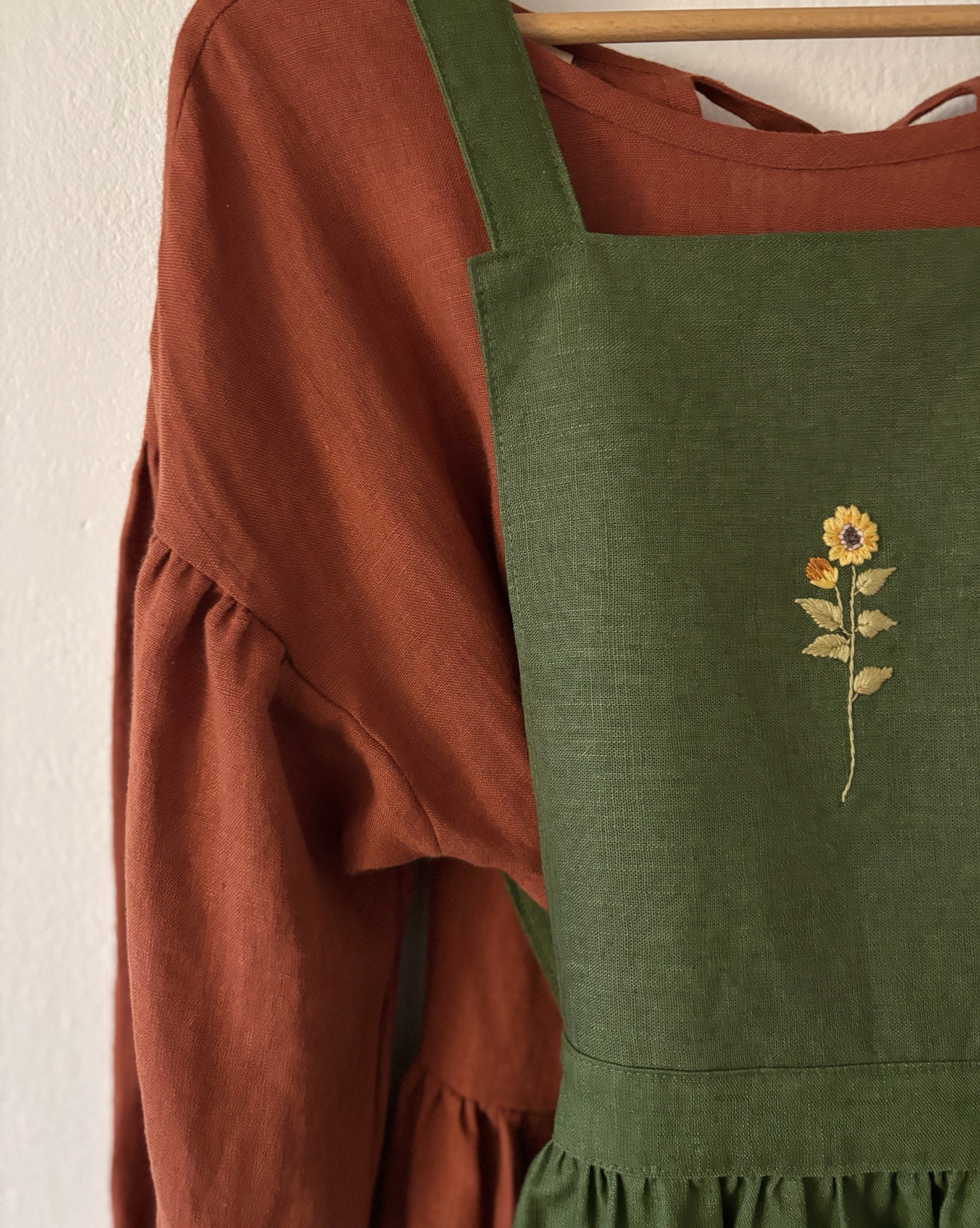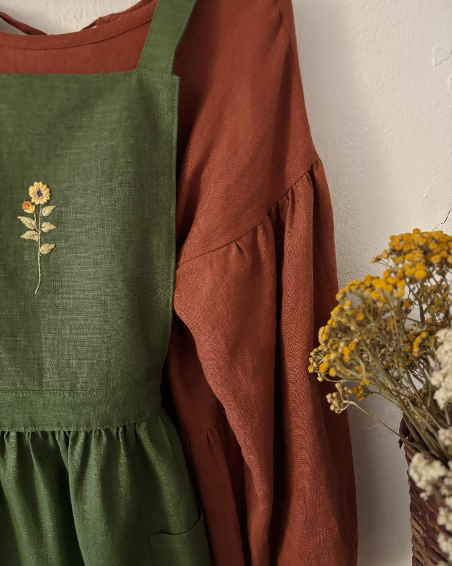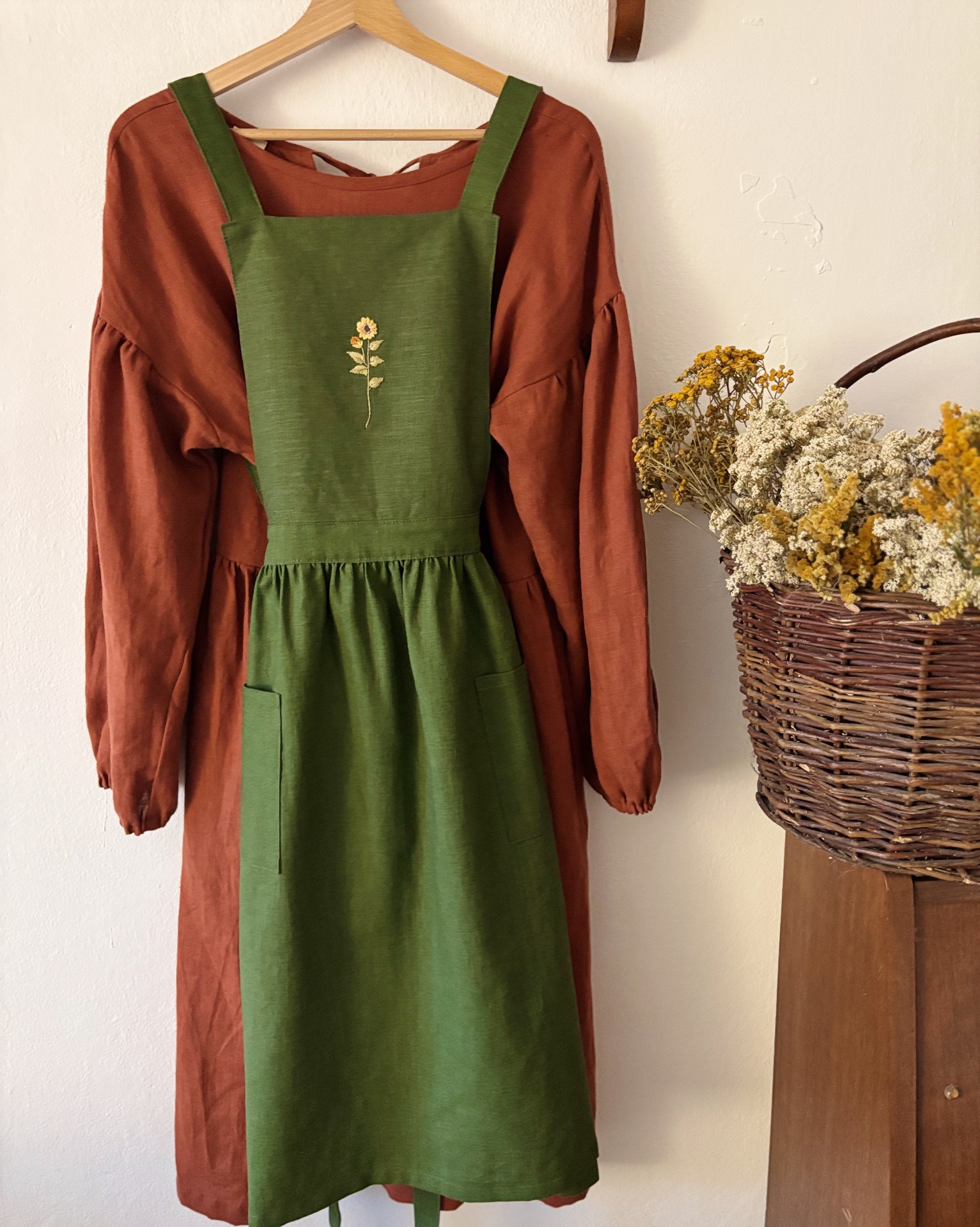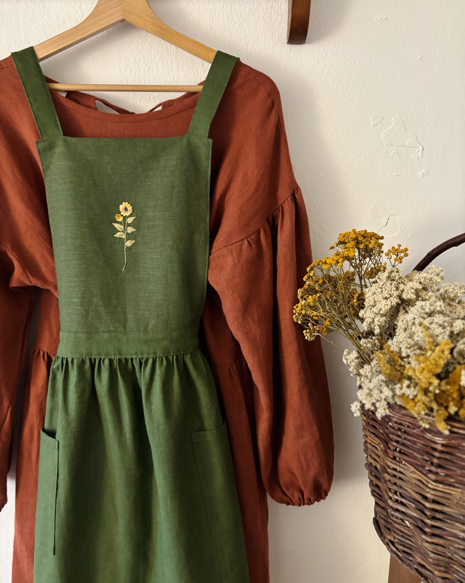 Lněná šatová zástěra - Lesní zelená - Slunečnice