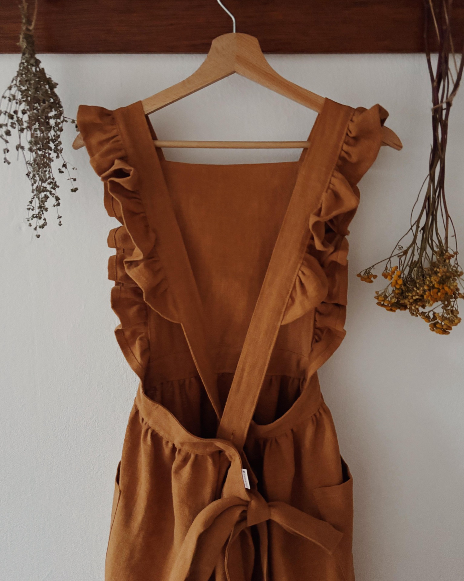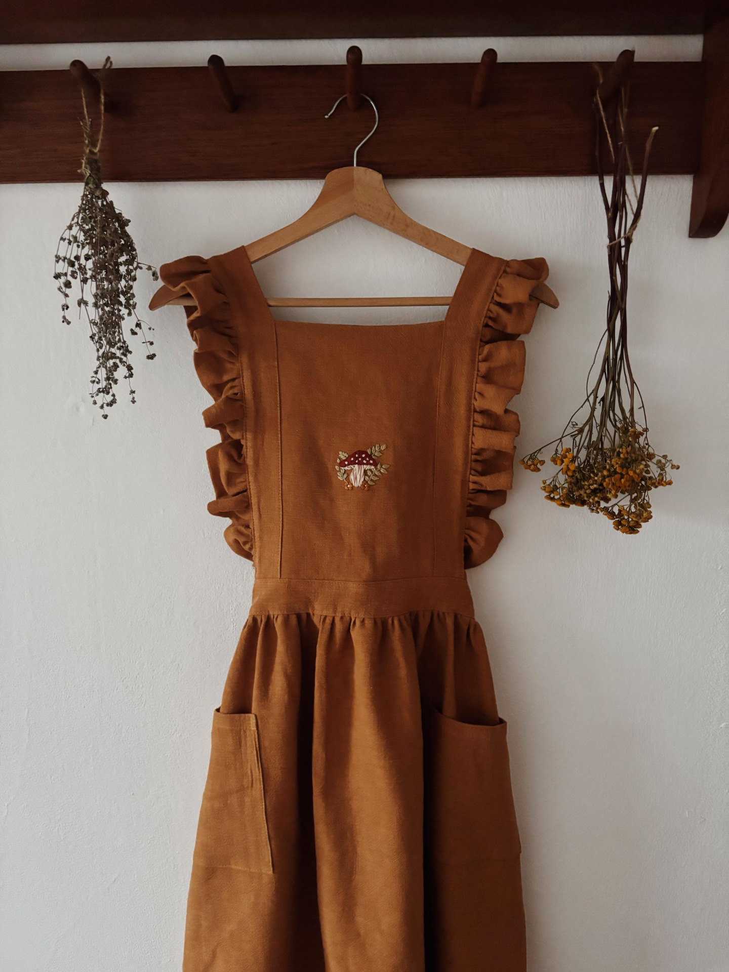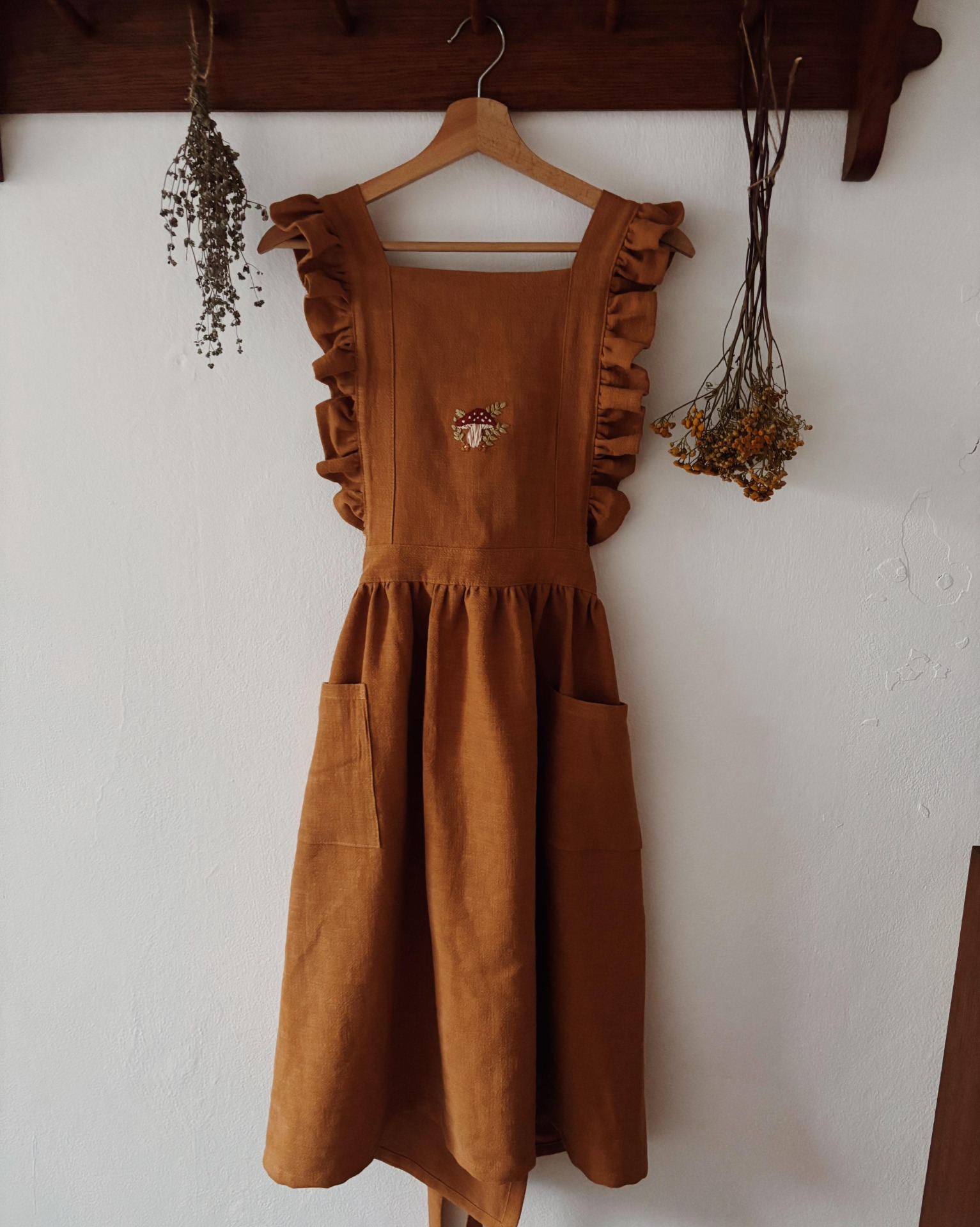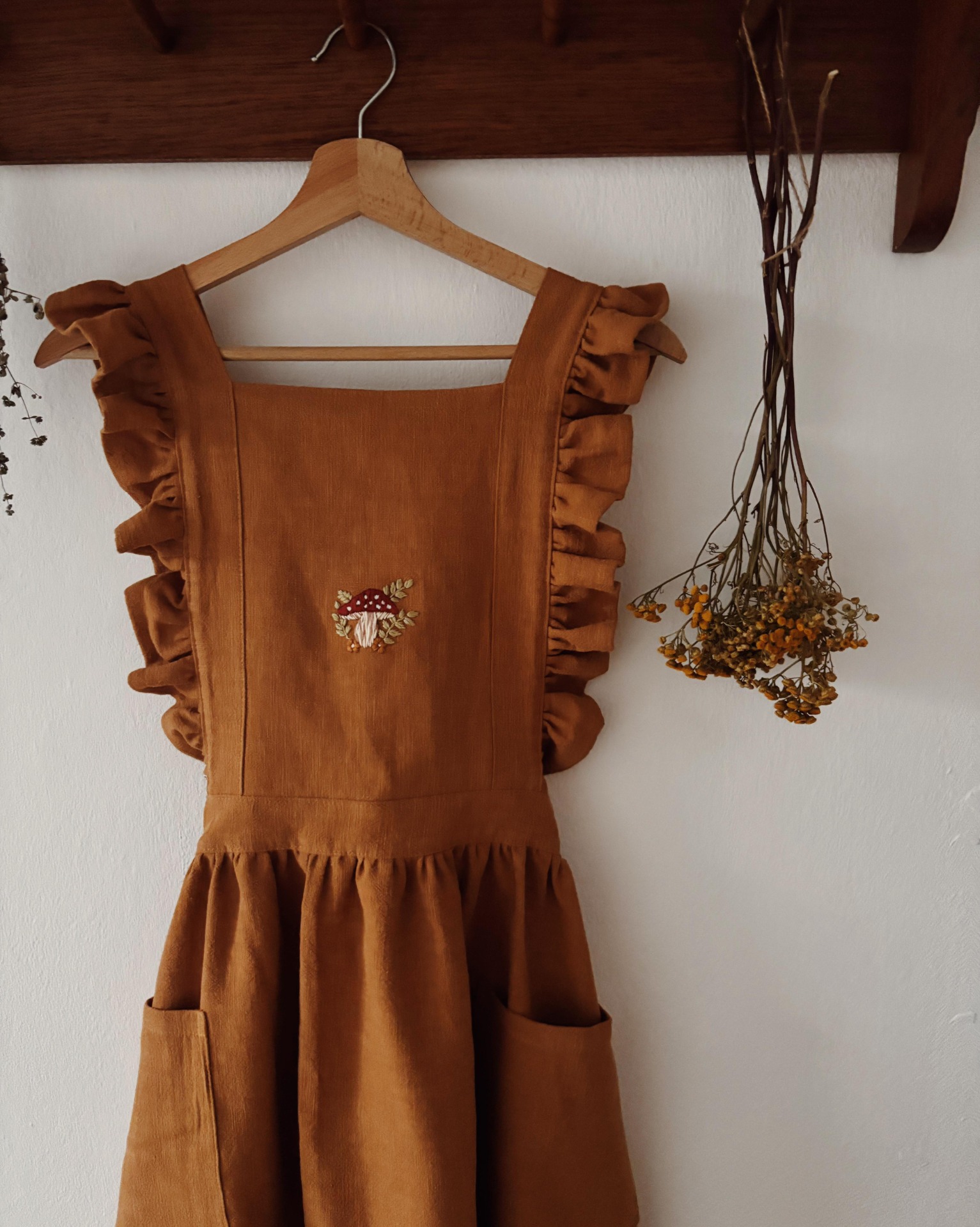 Lněná šatová zástěra s volánky - Skořicová s muchomůrkou
