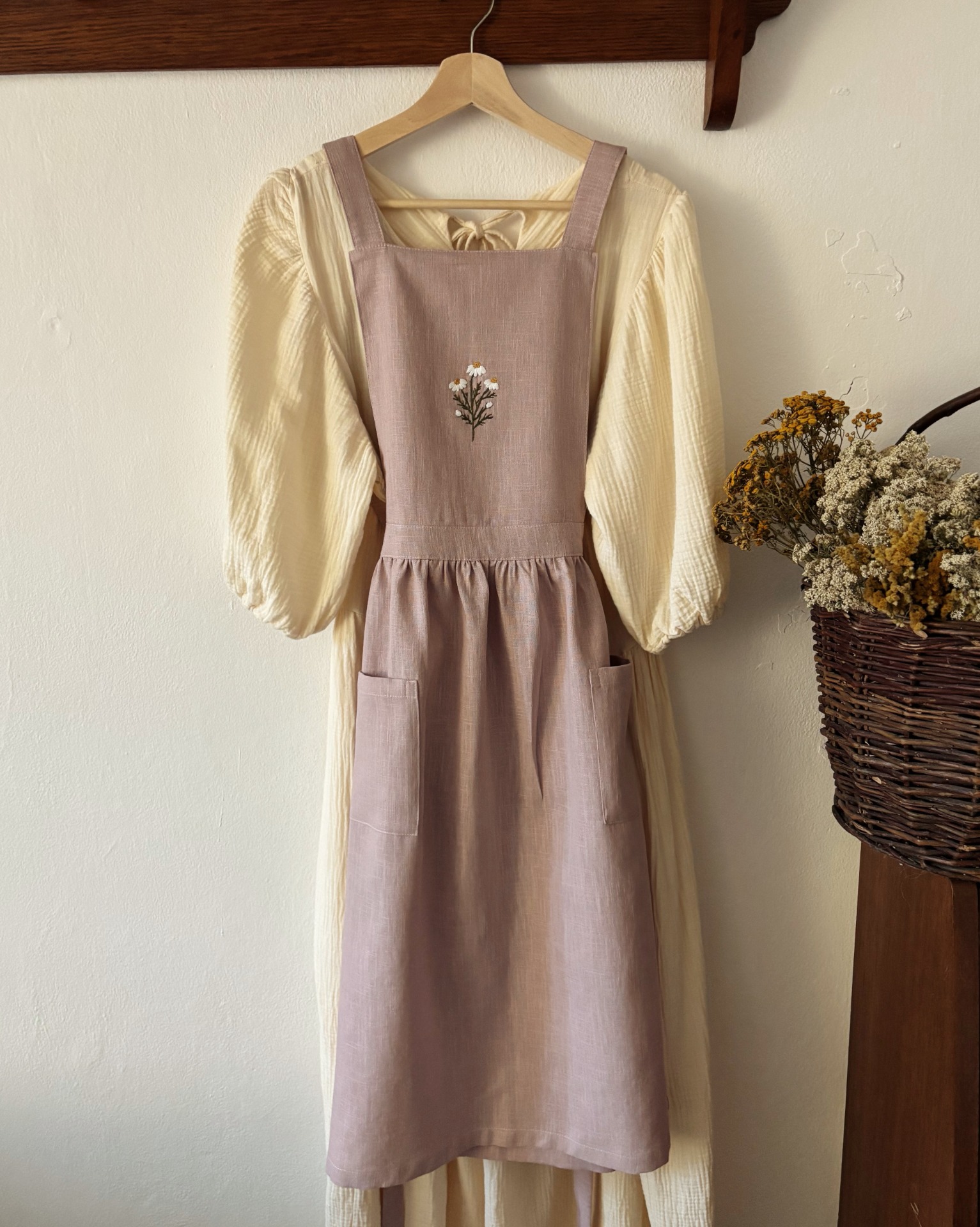 Ručně vyšívaná lněná venkovská zástěra pro milovnice cottagecore stylu, rustikální kuchyně, venkovského života a kvalitní ruční práce. Perfektní jako dárek pro milovníky pečení, vaření nebo zahradničení.