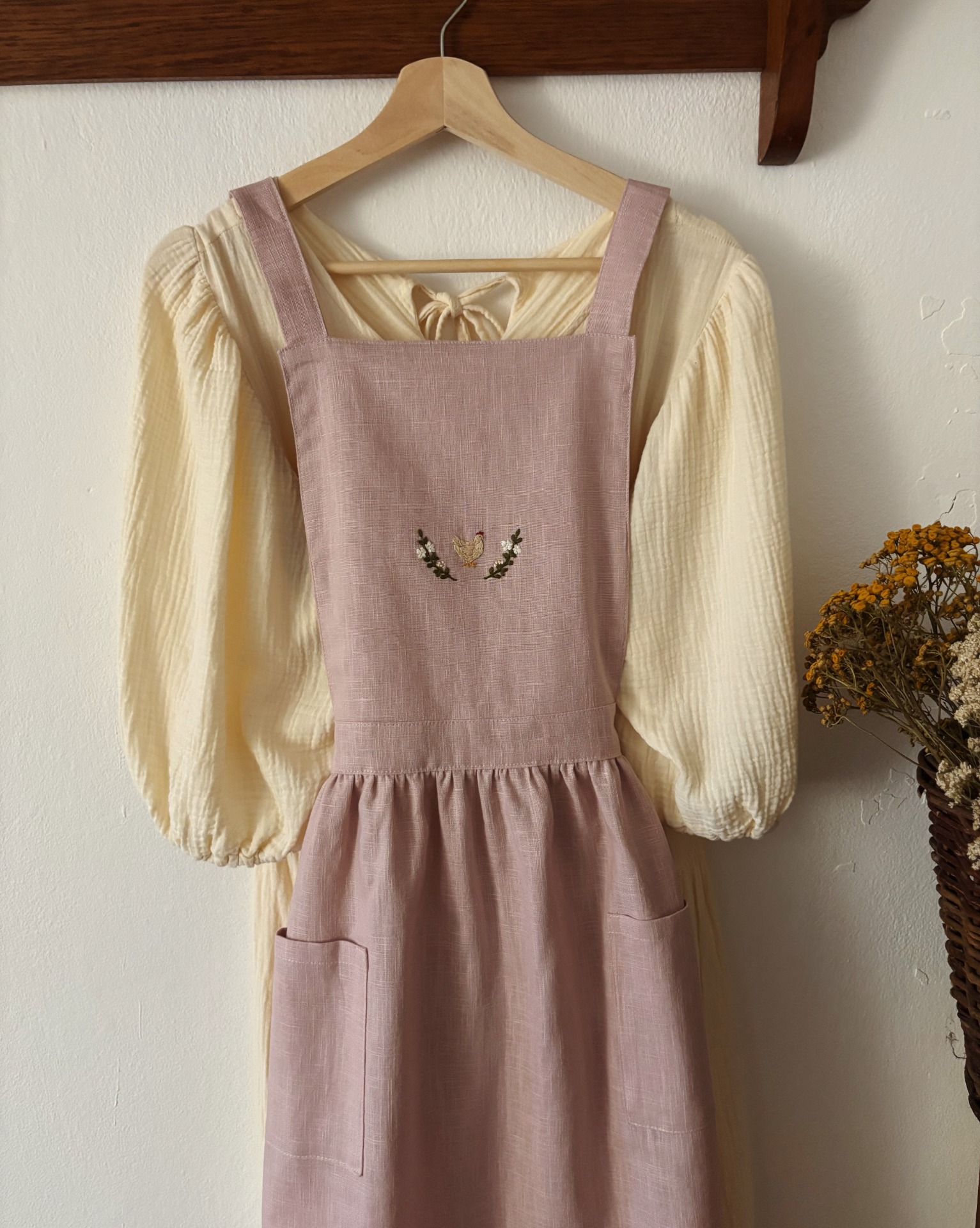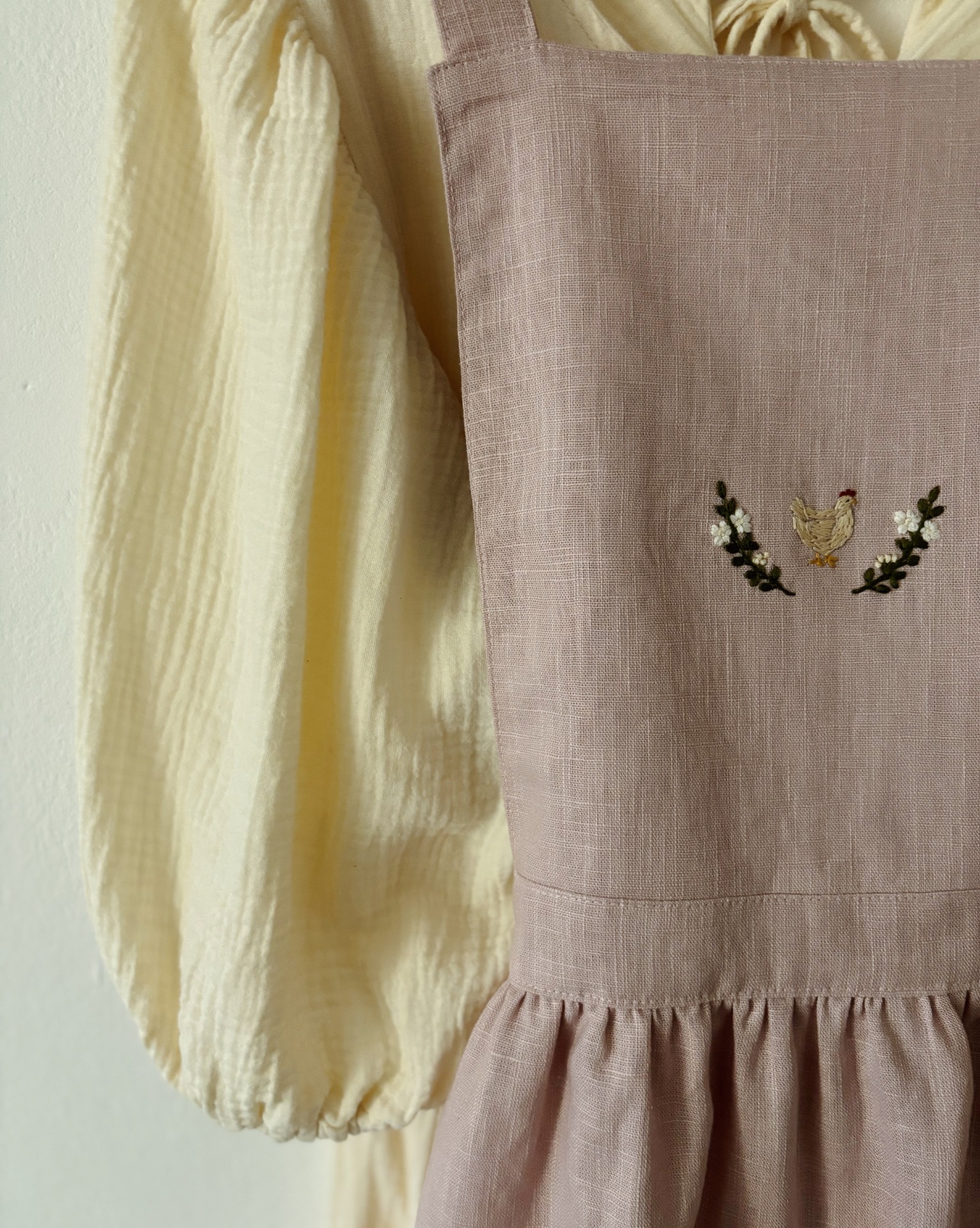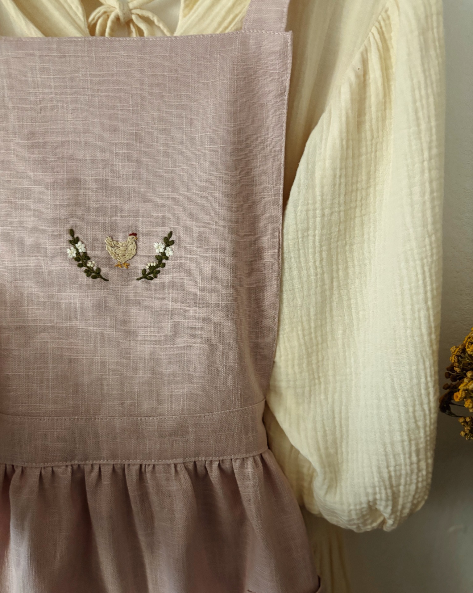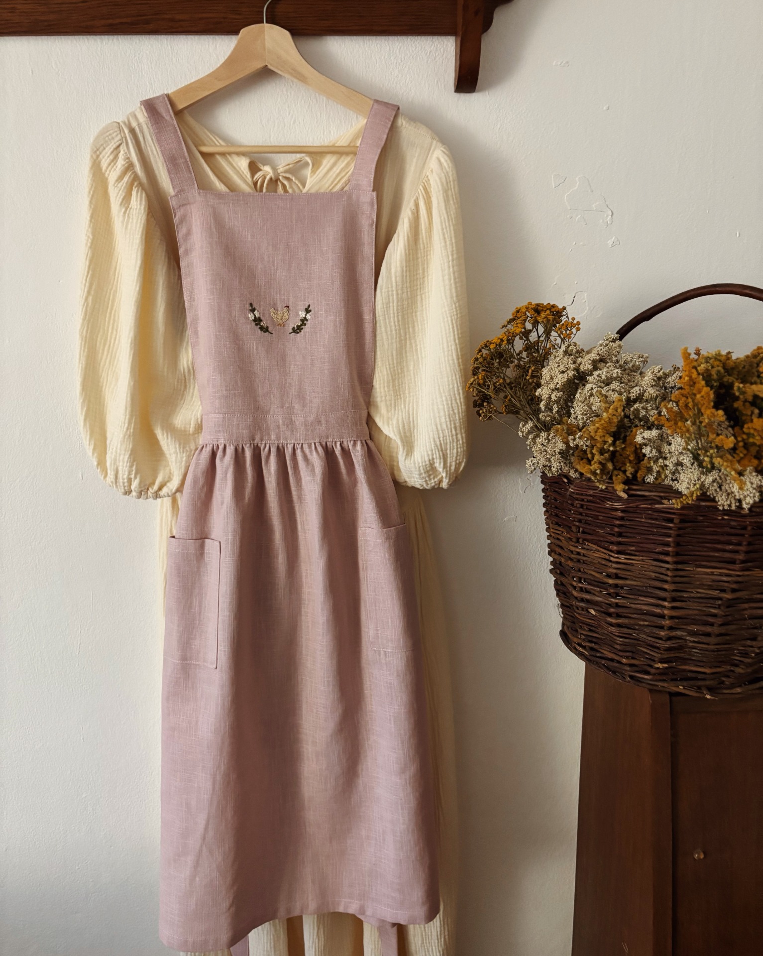 Ručně vyšívaná lněná venkovská zástěra pro milovnice cottagecore stylu, rustikální kuchyně, venkovského života a kvalitní ruční práce. Perfektní jako dárek pro milovníky pečení, vaření nebo zahradničení.