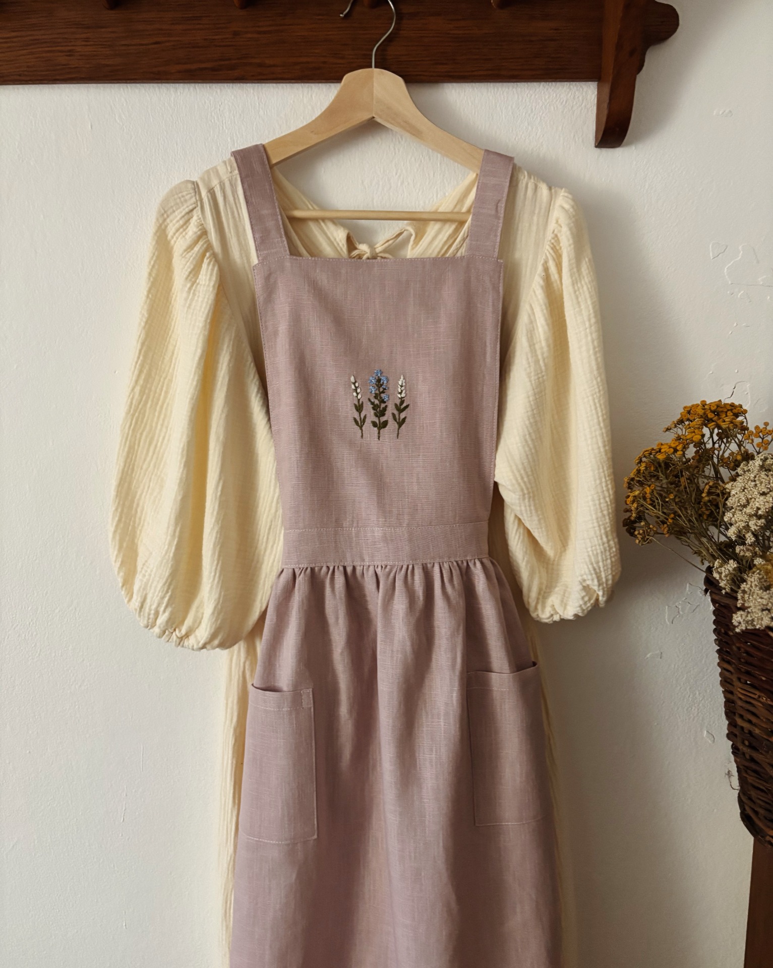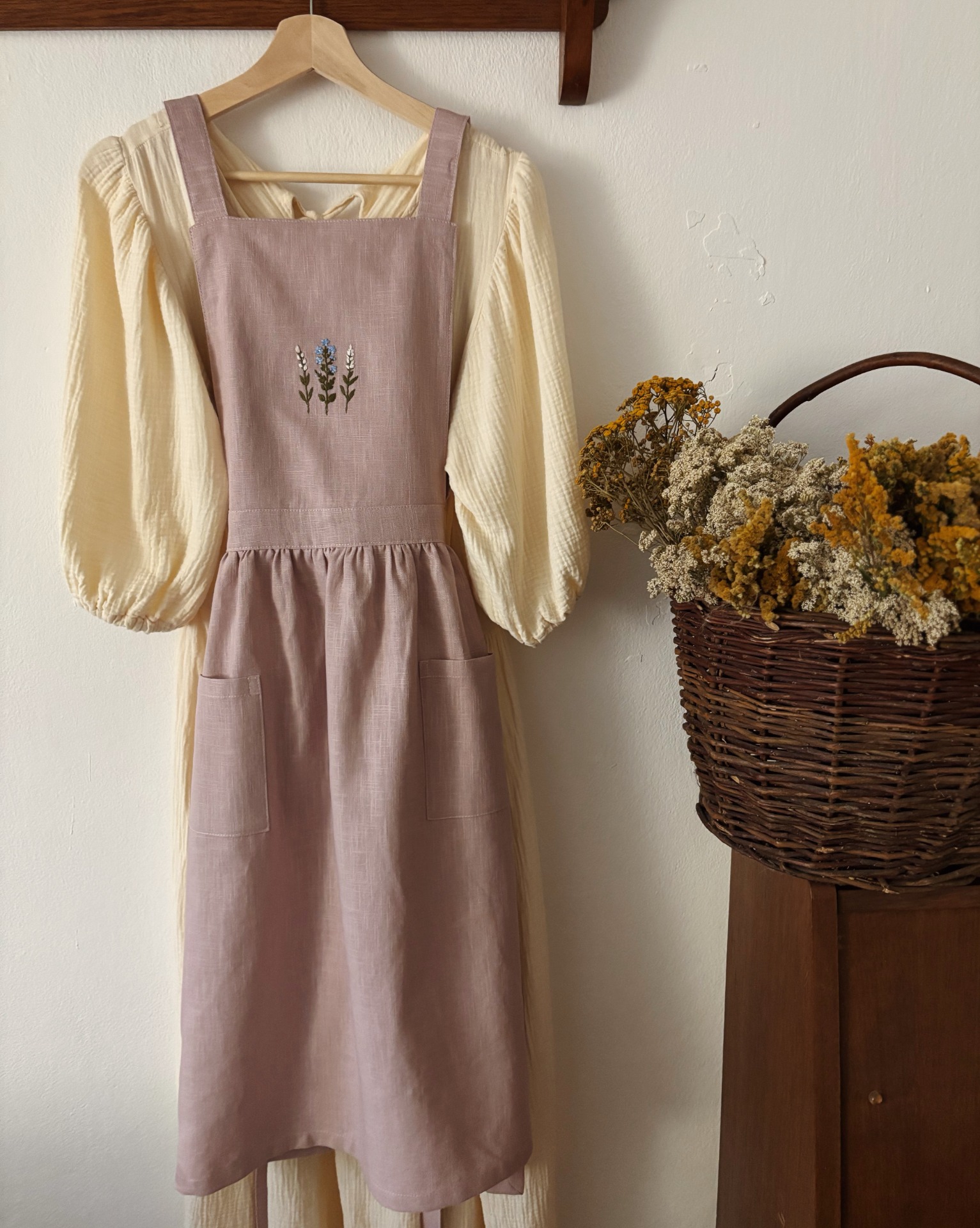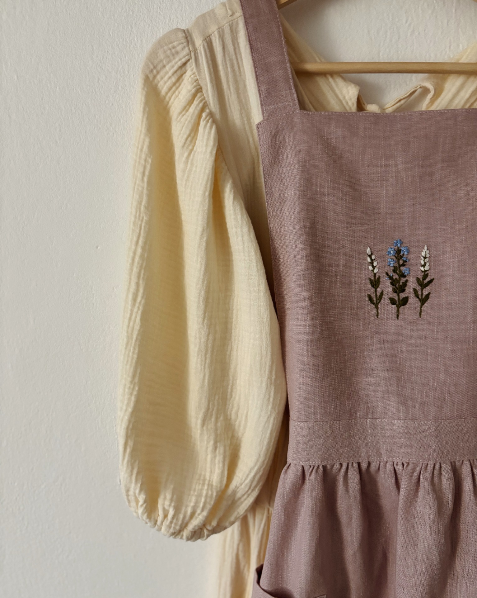 Ručně vyšívaná lněná venkovská zástěra pro milovnice cottagecore stylu, rustikální kuchyně, venkovského života a kvalitní ruční práce. Perfektní jako dárek pro milovníky pečení, vaření nebo zahradničení.