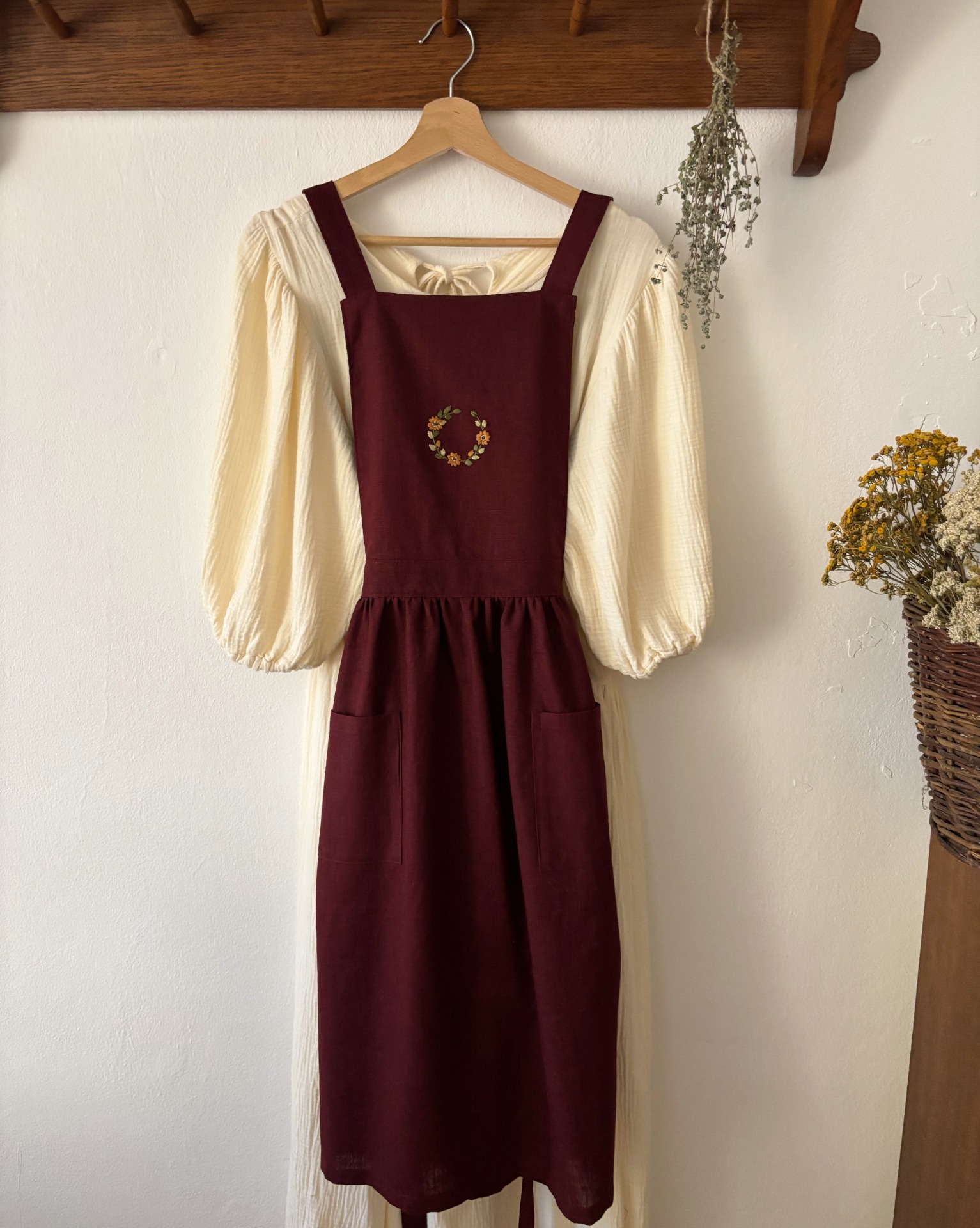 Lněná šatová zástěra - Vínová/Bordó - Slunečnicový věnec