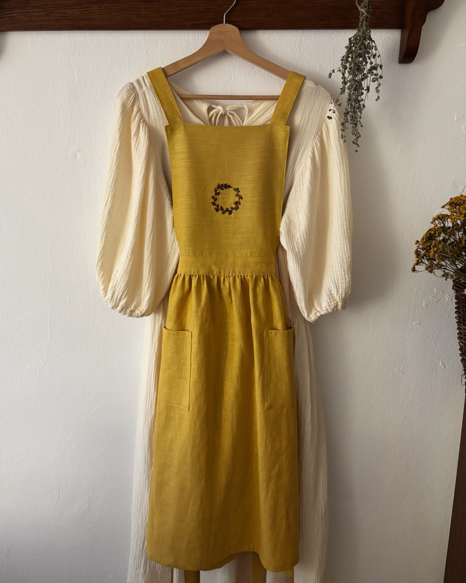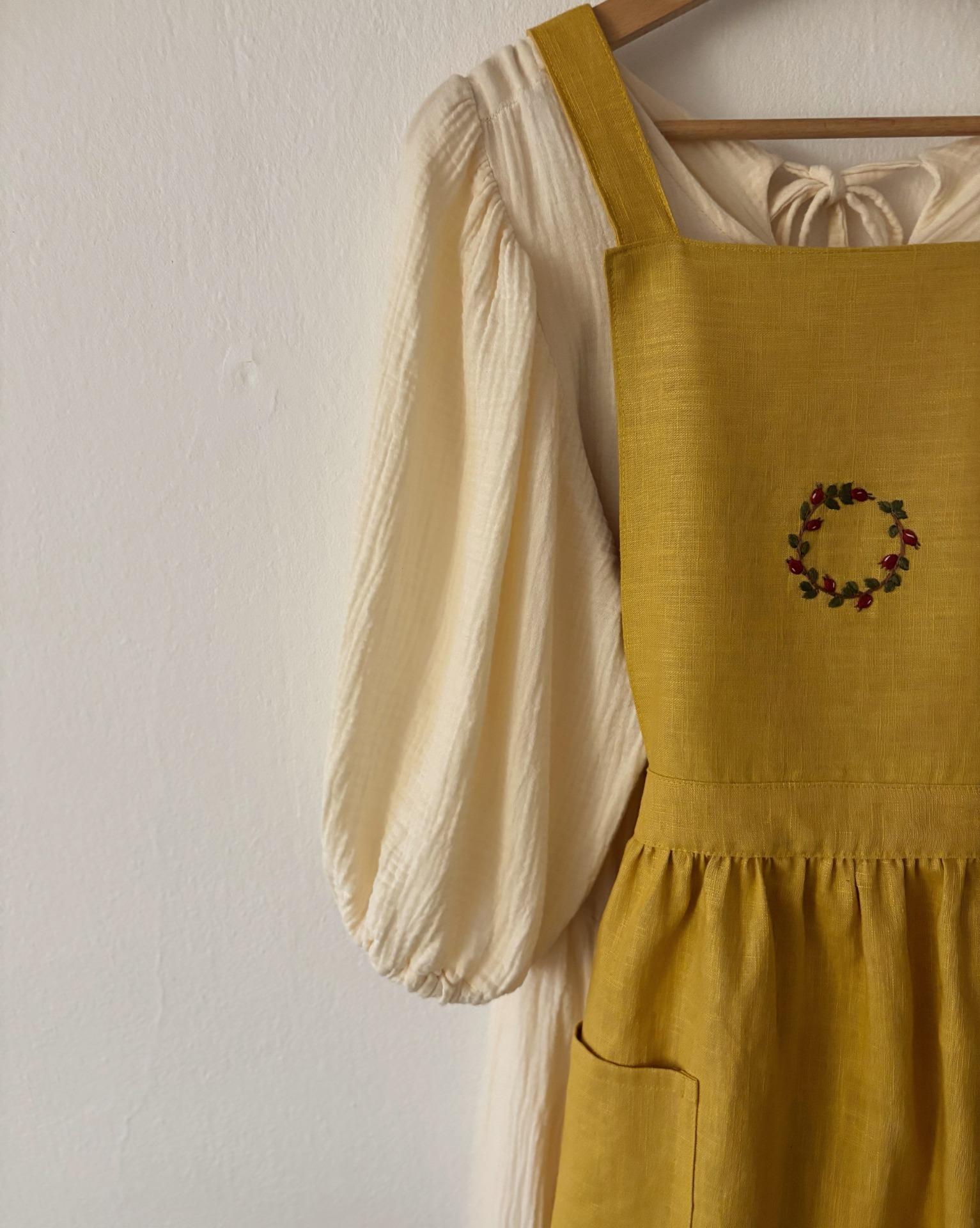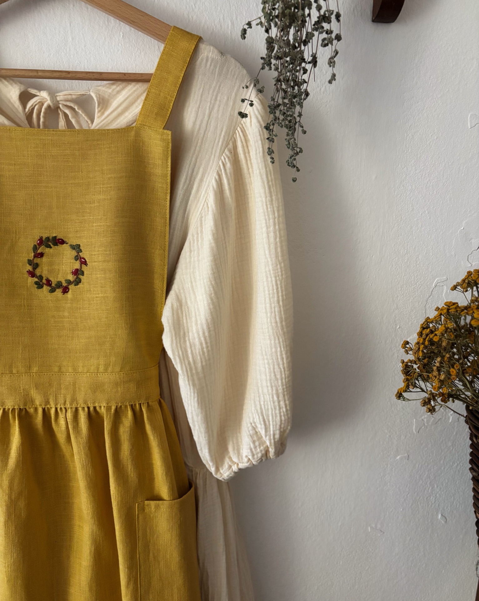 Lněná šatová zástěra - Hořčicová/Okrová - Šípkový věnec
