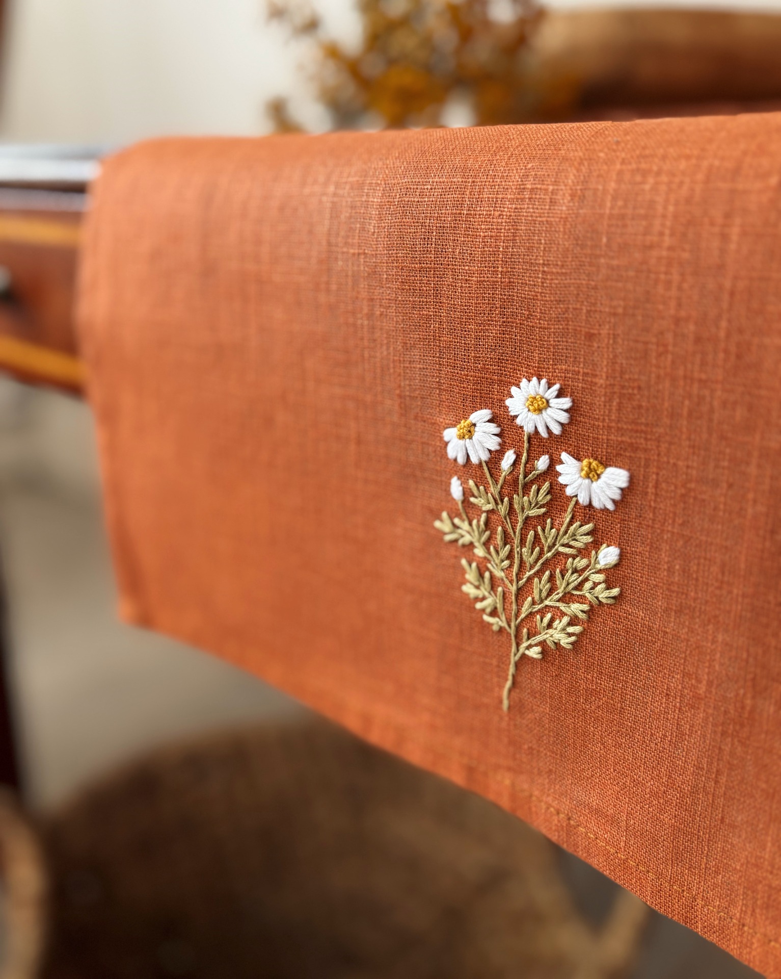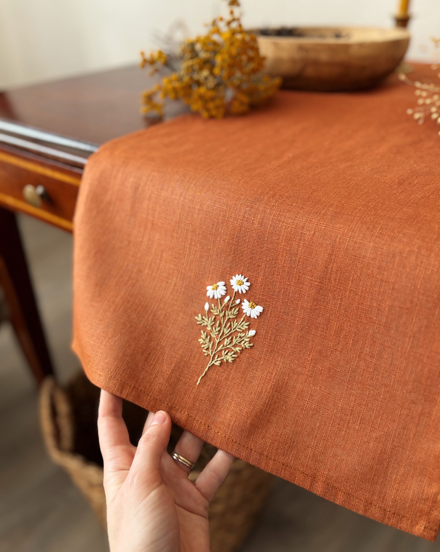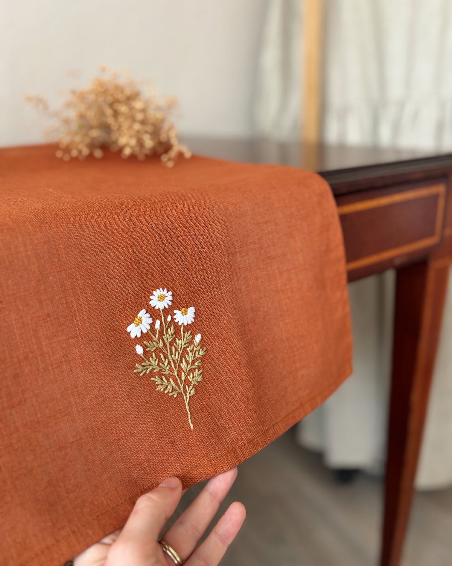 Ručně vyšívaný lněný běhoun - Terakotově hnědá s heřmánkem