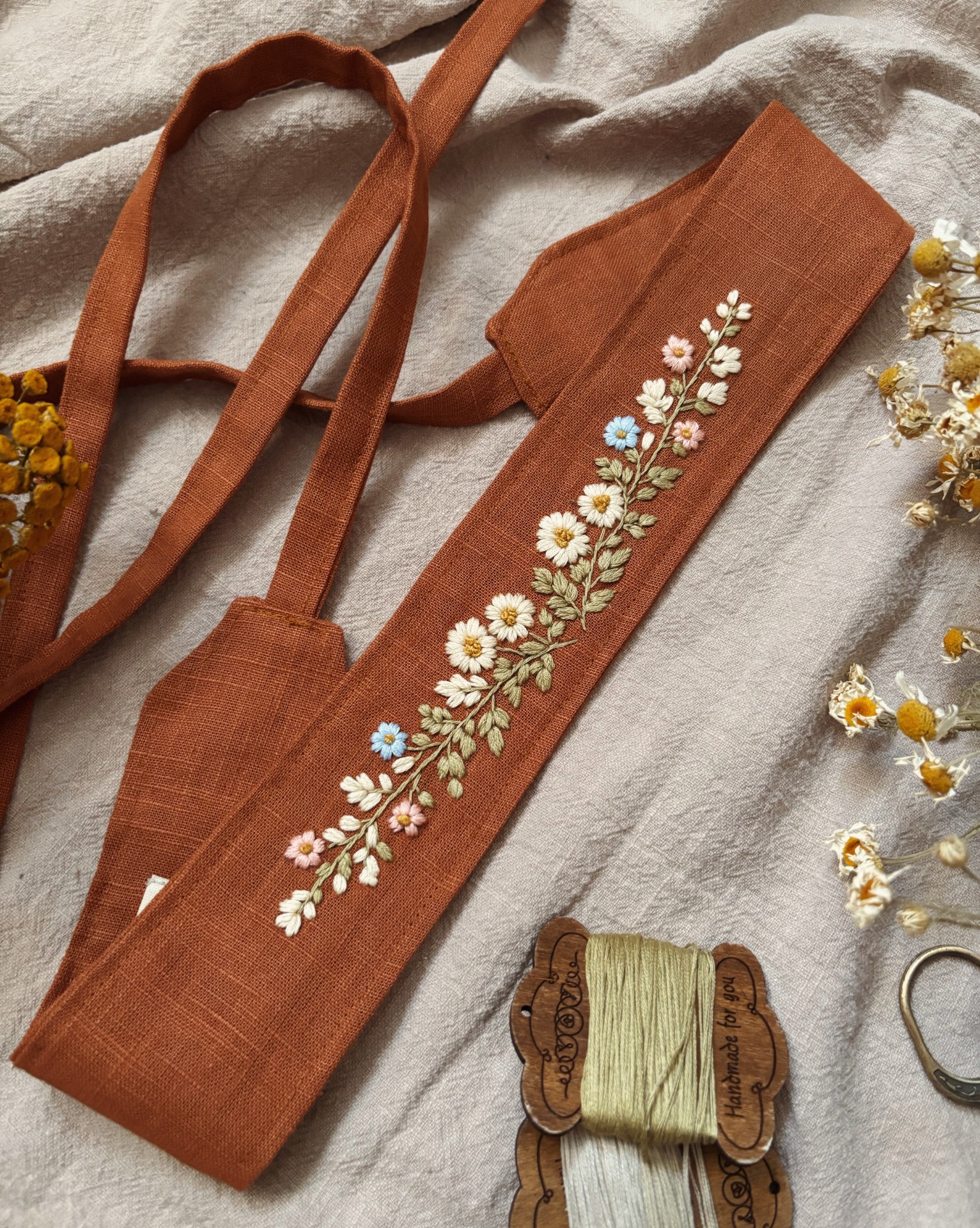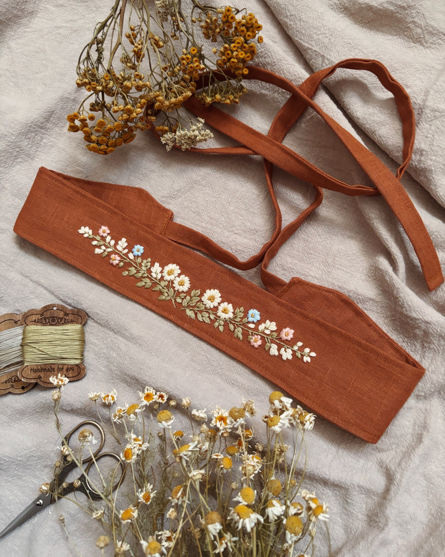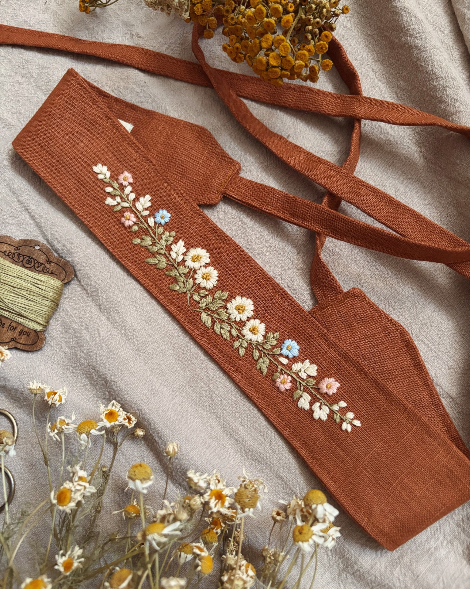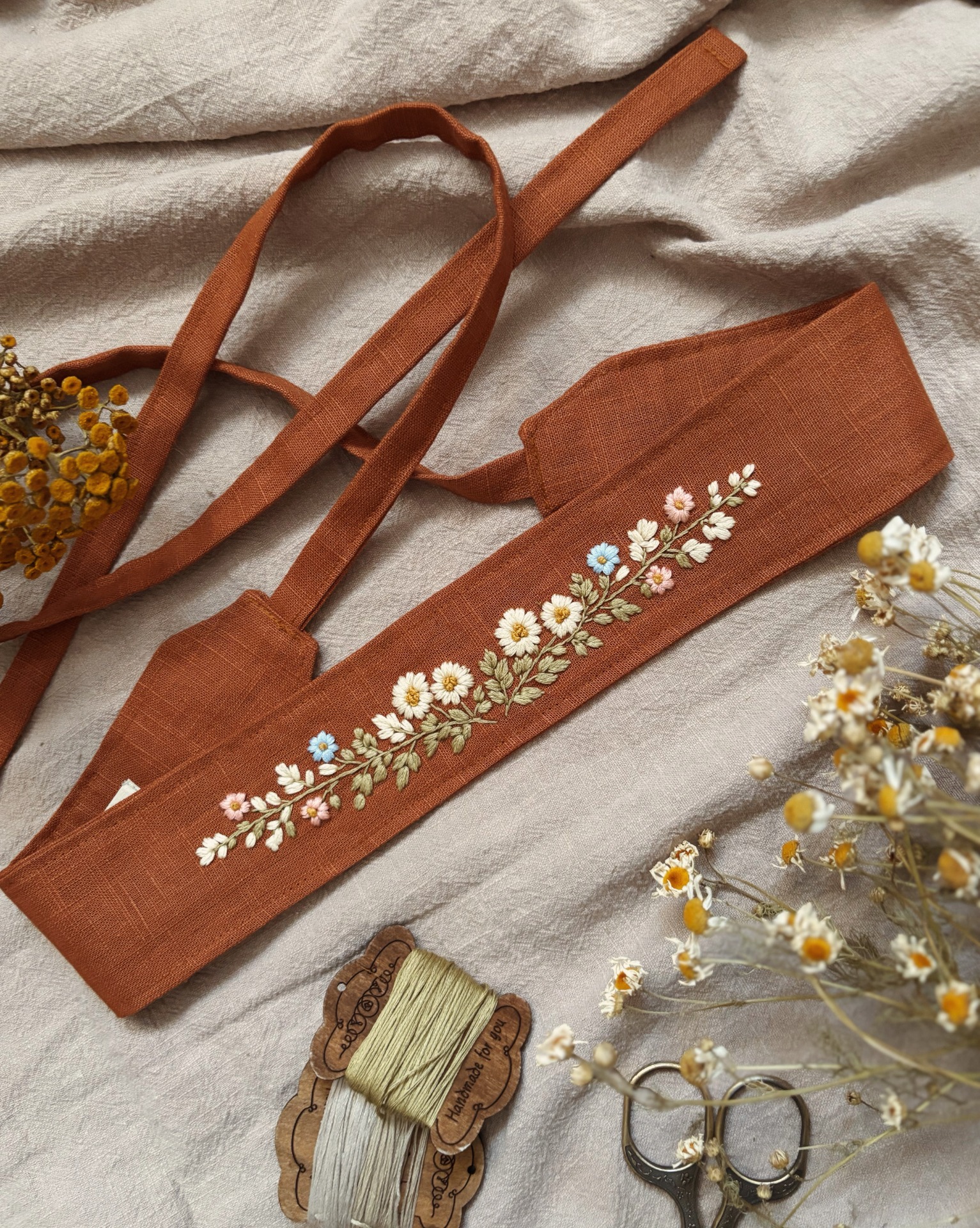 Ručně vyšívaný lněný opasek - Luční květiny (terakotově hnědý)