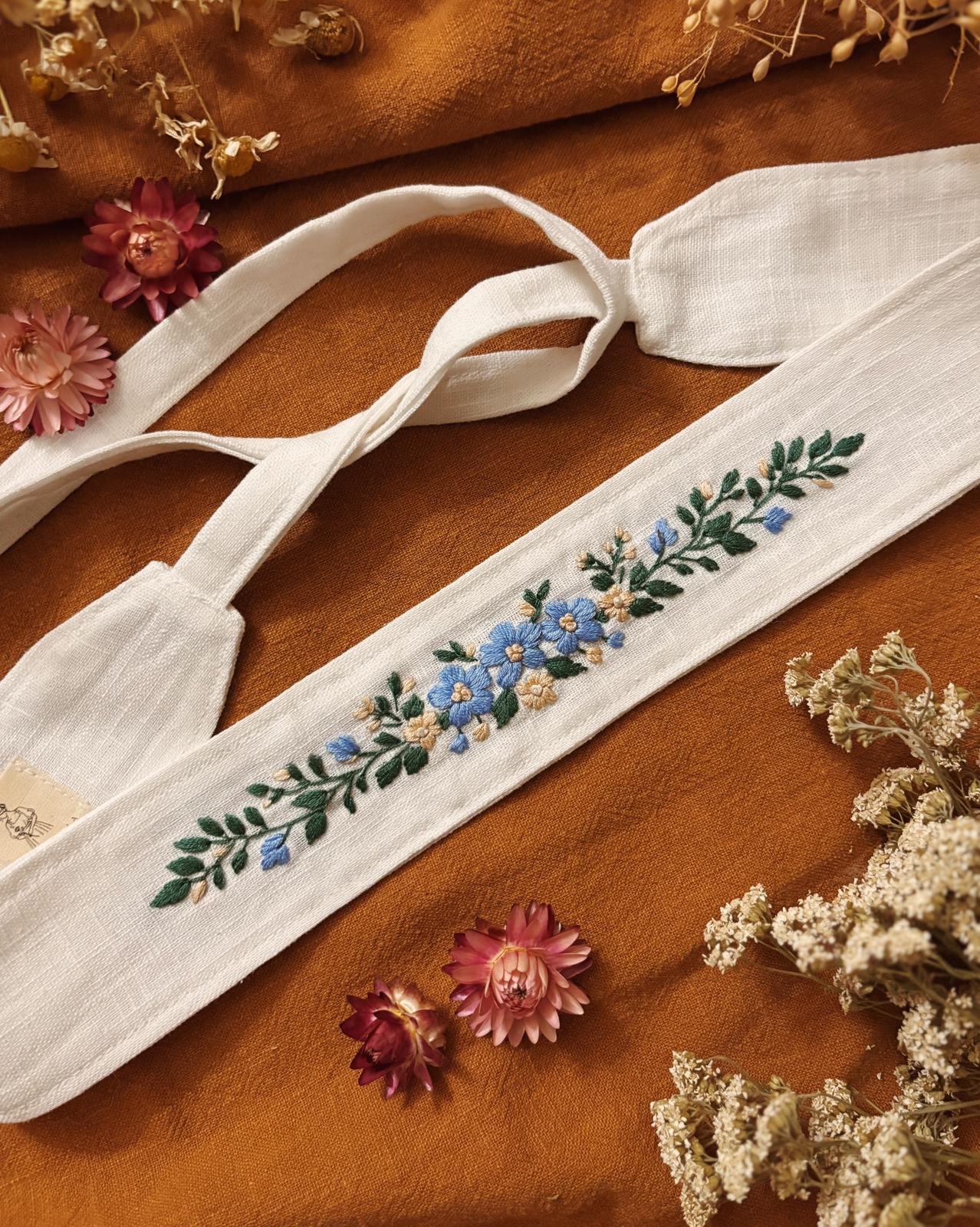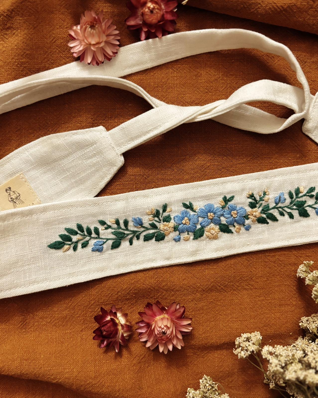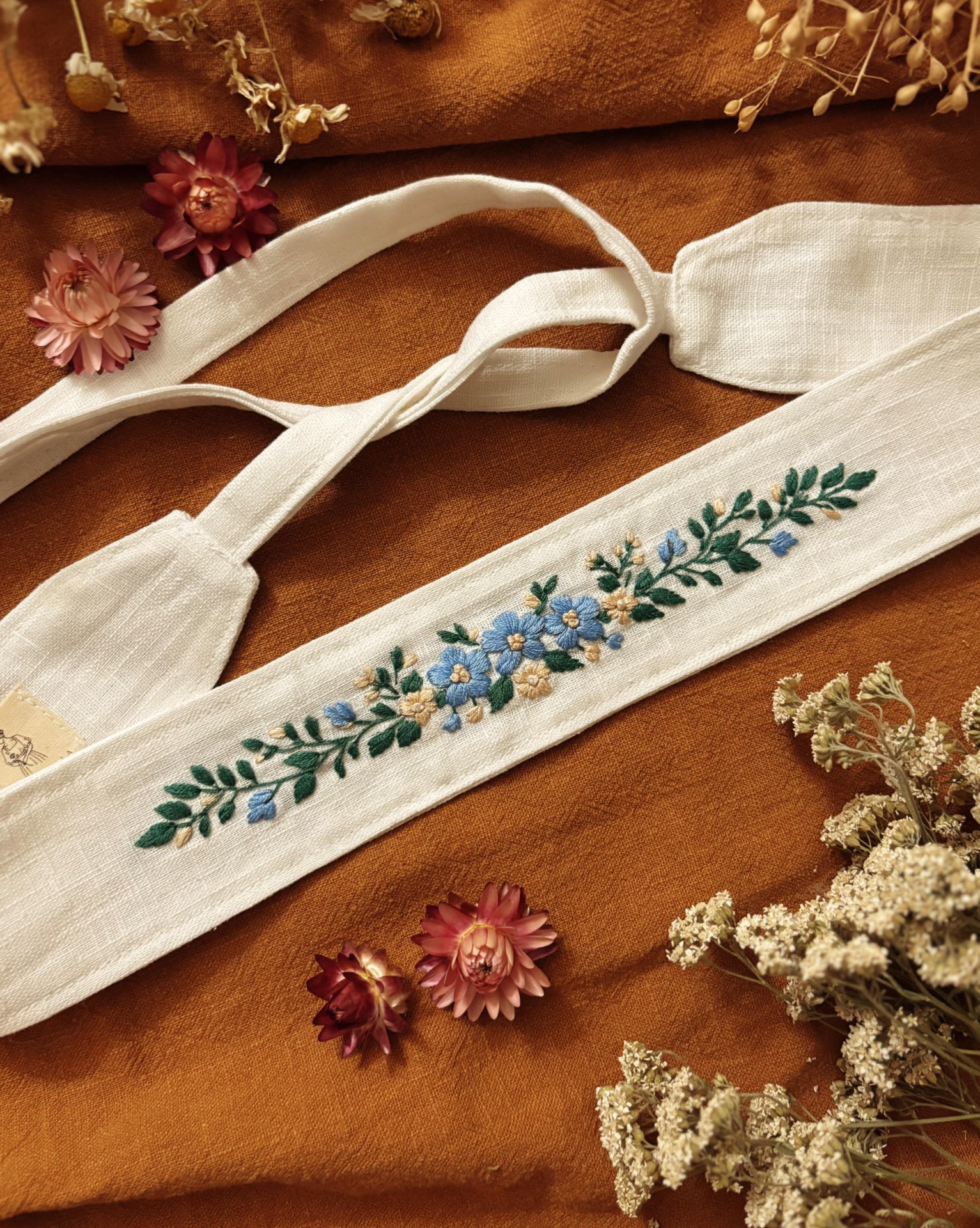 Tento jemně vyšívaný lněný opasek je romantickým doplňkem, který podtrhne přirozenou krásu a něžnost svatebního dne. Každý kus osobně navrhuji, šiji a zdobím ruční výšivkou inspirovanou přírodou, díky čemuž je každý opasek originál.