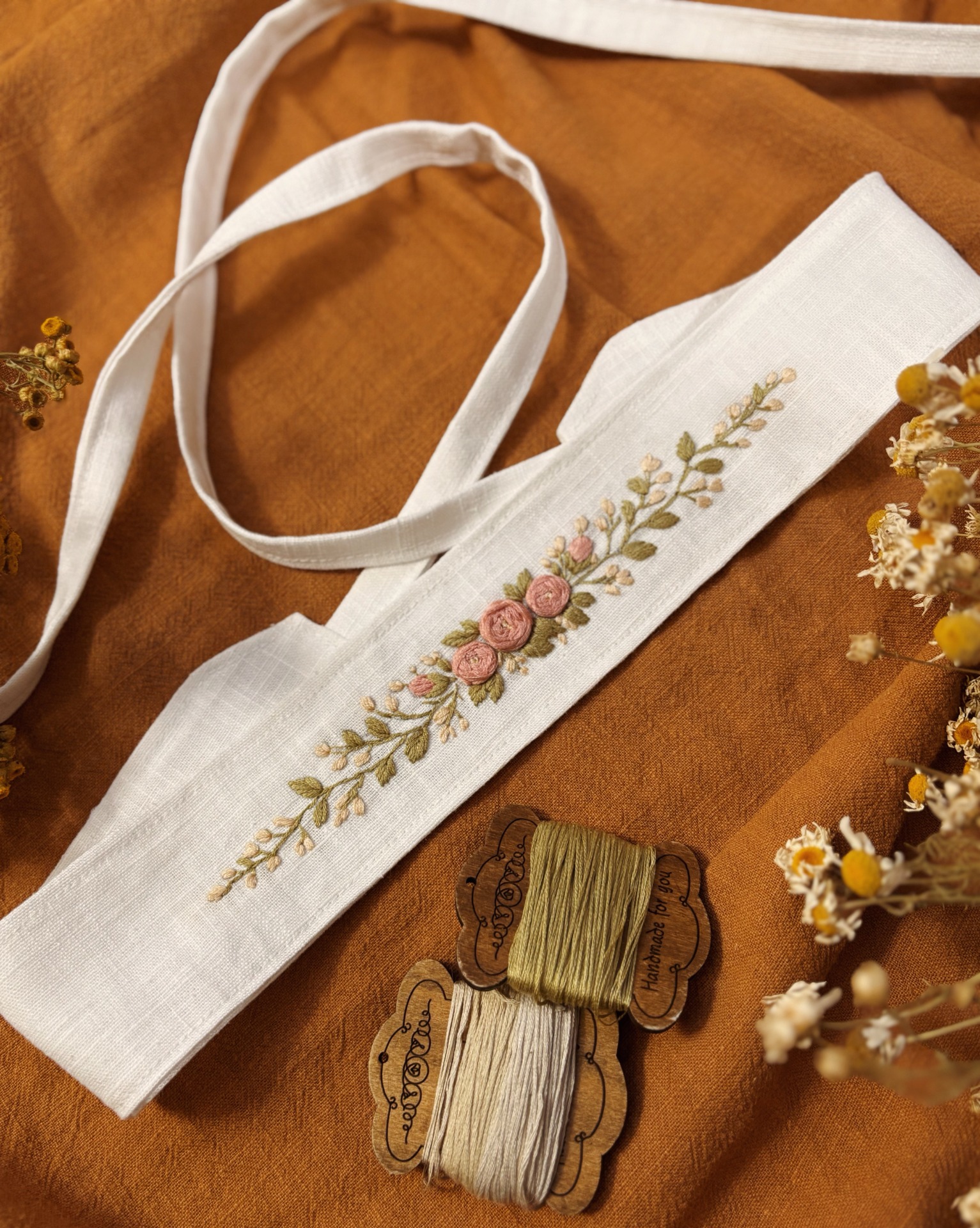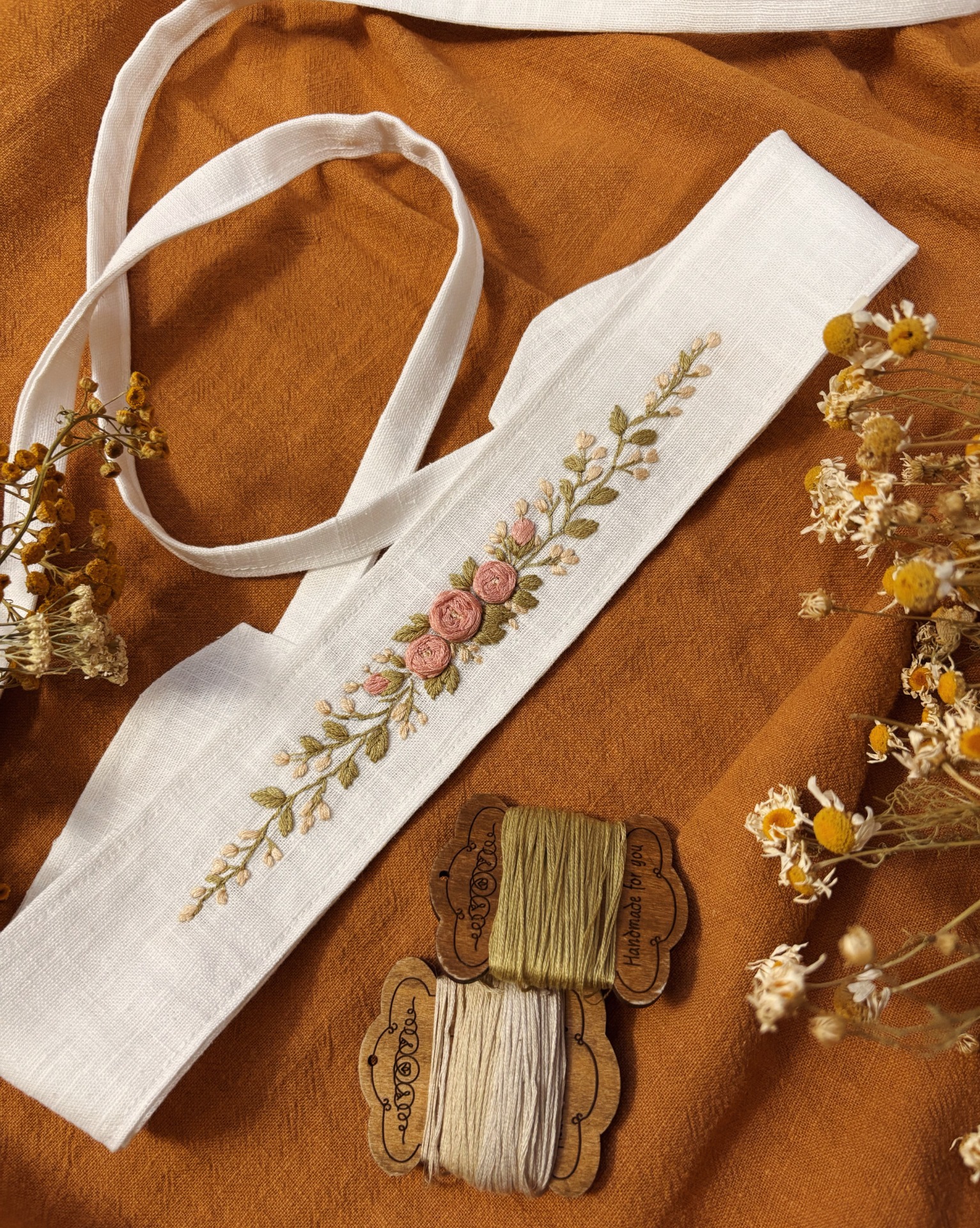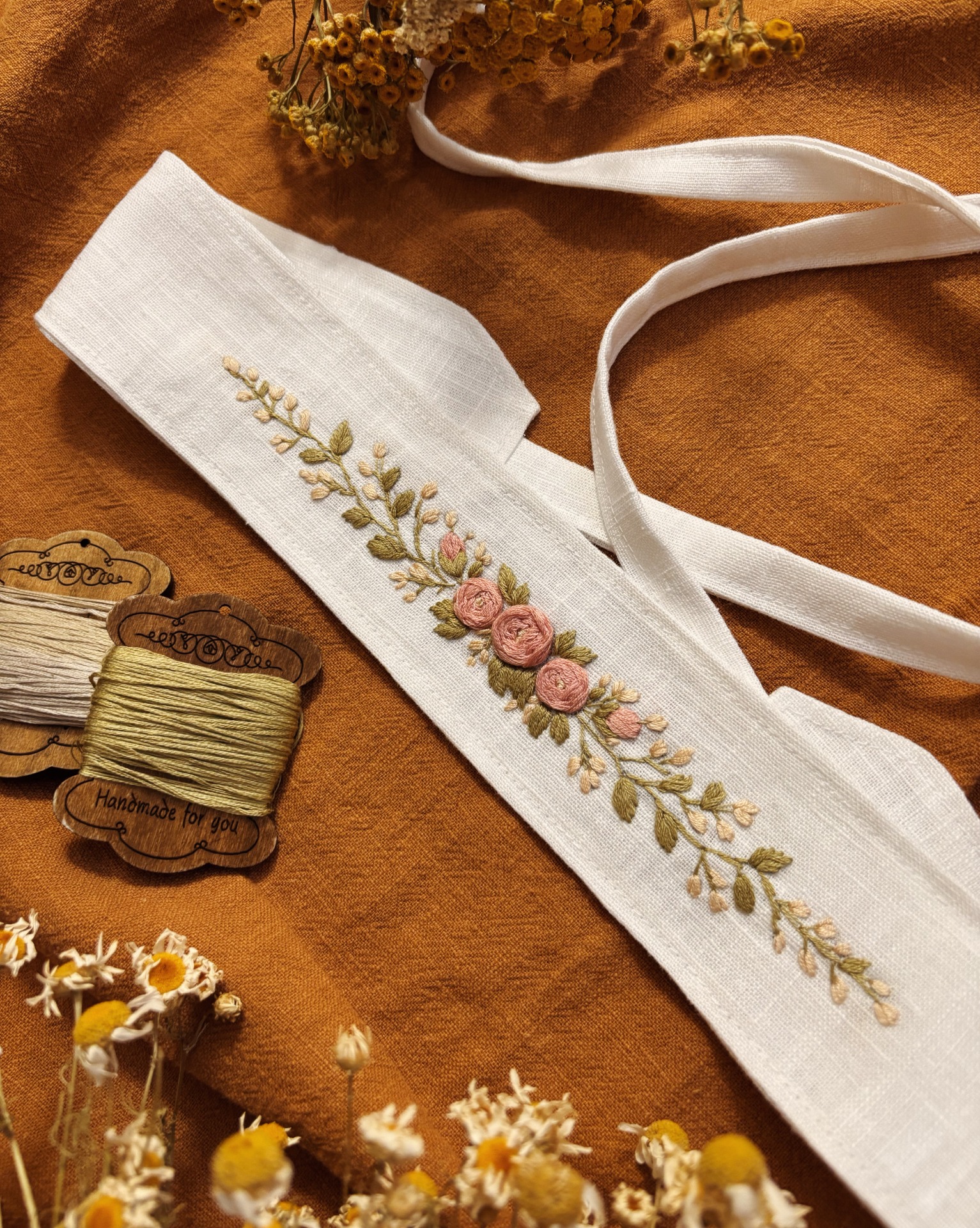 Tento jemně vyšívaný lněný opasek je romantickým doplňkem, který podtrhne přirozenou krásu a něžnost nejen svatebního dne. Každý kus osobně navrhuji, šiji a zdobím ruční výšivkou inspirovanou přírodou, díky čemuž je každý opasek originál.