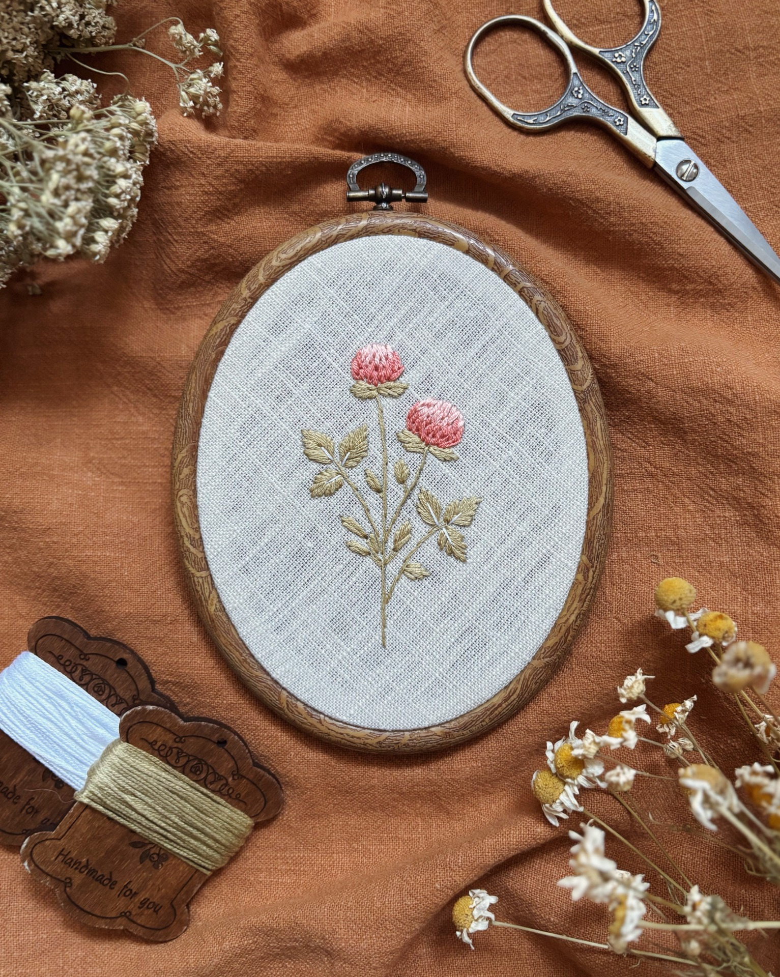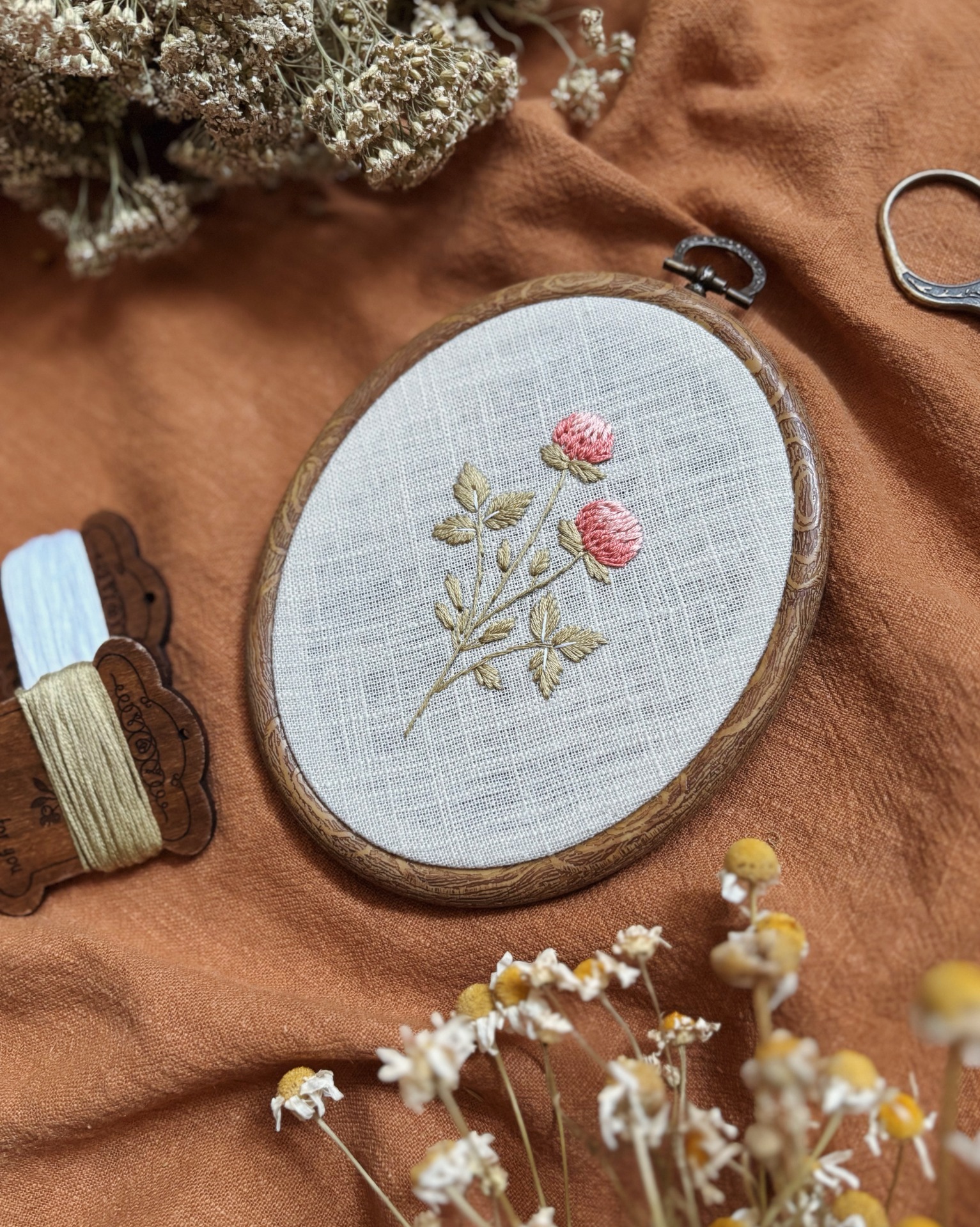 Ručně vyšívaný obrázek - Jetel na béžovém podkladu
