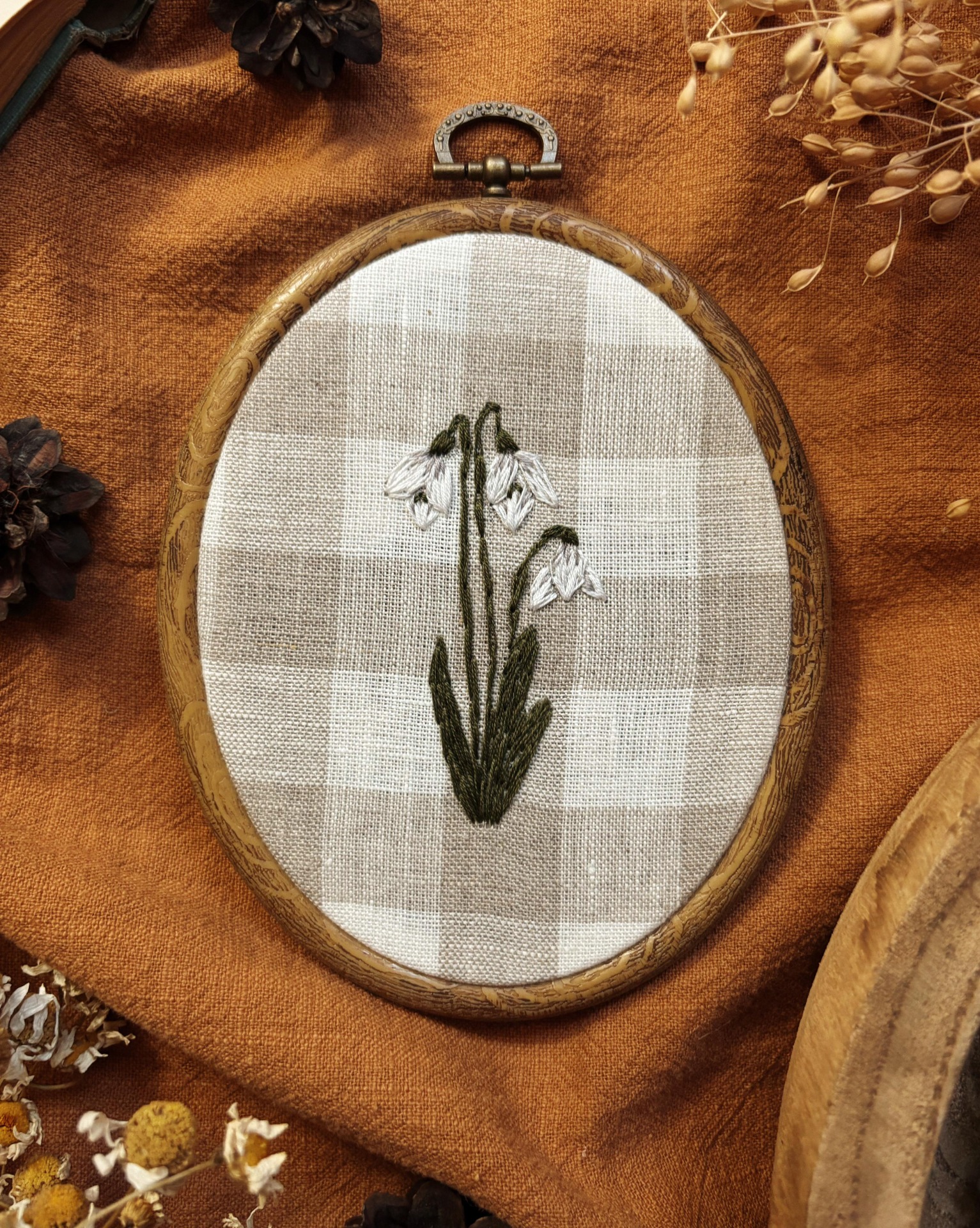 Ručně vyšívaný obrázek - Sněženky na kostkovaném podkladě